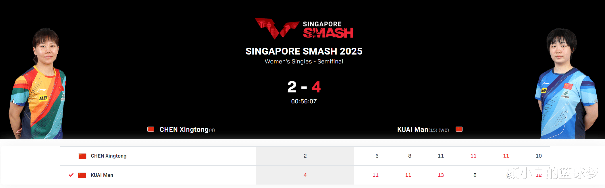 北京时间2月8日,WTT新加坡大满贯,女单半决赛,蒯曼4-2淘汰陈幸同晋级决赛,六局比分:11-6,11-8,13-11,8-11,8-11,12-10。也就是说蒯曼开场一度是取得了3-0的巨大领先优势,陈幸同连扳两局后,在第六局被蒯曼击败。