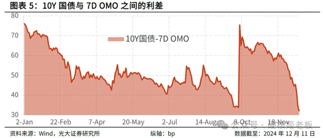 截至12月11日,10Y国债与OMO间的利差为32.18bp,已形成了2023年初以来的极低值。