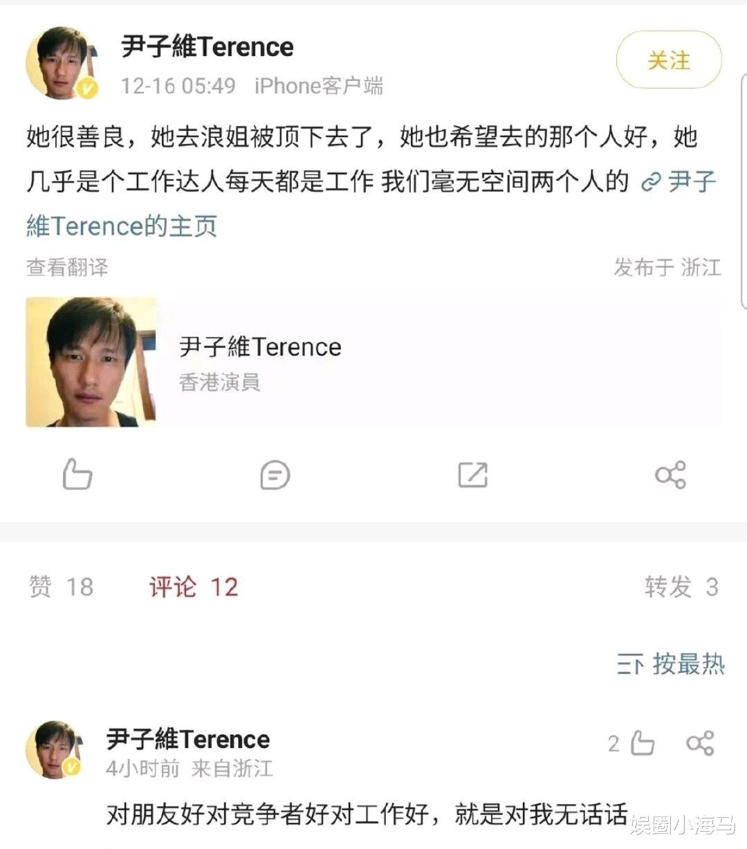 而就在众人称赞他的敢爱敢恨时,尹子维又连发两条消息,表示徐冬冬是不婚主义者,对朋友好对竞争者者好对工作好,就是对他无话可说。最后他还向网友咨询,怎么样才能够好好照顾徐冬冬!