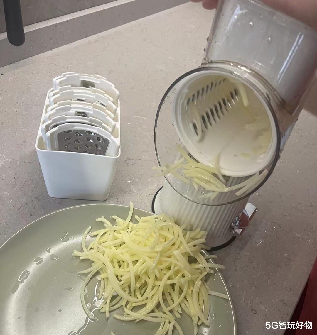 不管是切土豆丝还是切波浪土豆片都不在话下。独立食材切割封闭仓,刀片镶嵌于切菜机内不与双手接触,减少安全隐患,防止意外受伤。不过我还是要提醒,因为刀片比较锋利,更换刀片时候也要注意不要划伤。