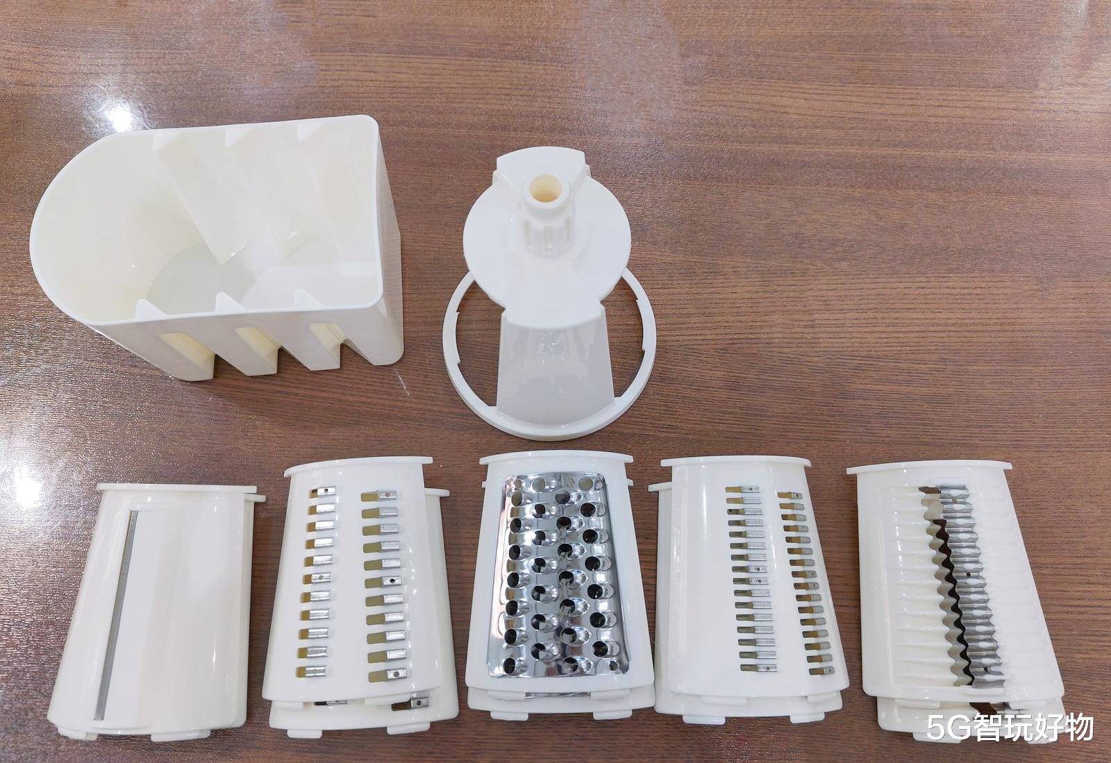 晶厨滚筒切菜器一共有五个切菜片,可以切片,也可以切丝,粗丝细丝都可以,还可以切波浪片,还可以研磨。切菜片的更换也很方便,在滚筒后方一按一掰,就可以取下来更换。360°包覆式滚筒双刃设计,满足了不同食材切配需求。还有一个刀具收纳盒,贴心细节很到位。