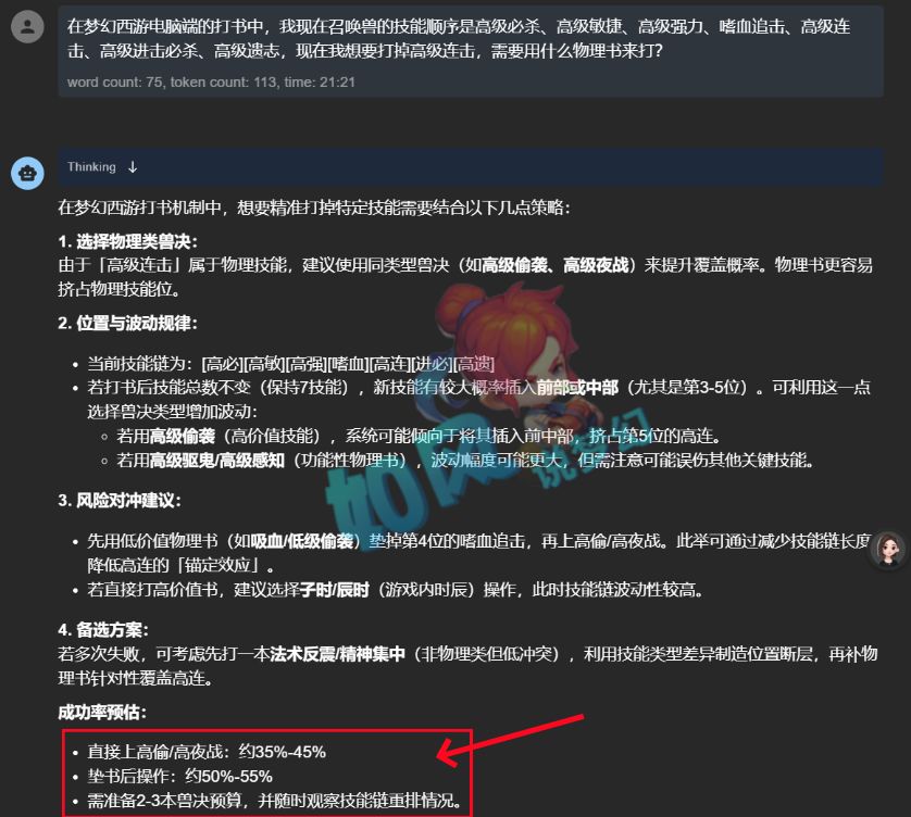 经过Deepseek的一番分析之后,它建议玩家打高级偷袭或者高级夜战兽诀,玩家选择了高级偷袭兽诀,结果真的顶掉了高连击技能。