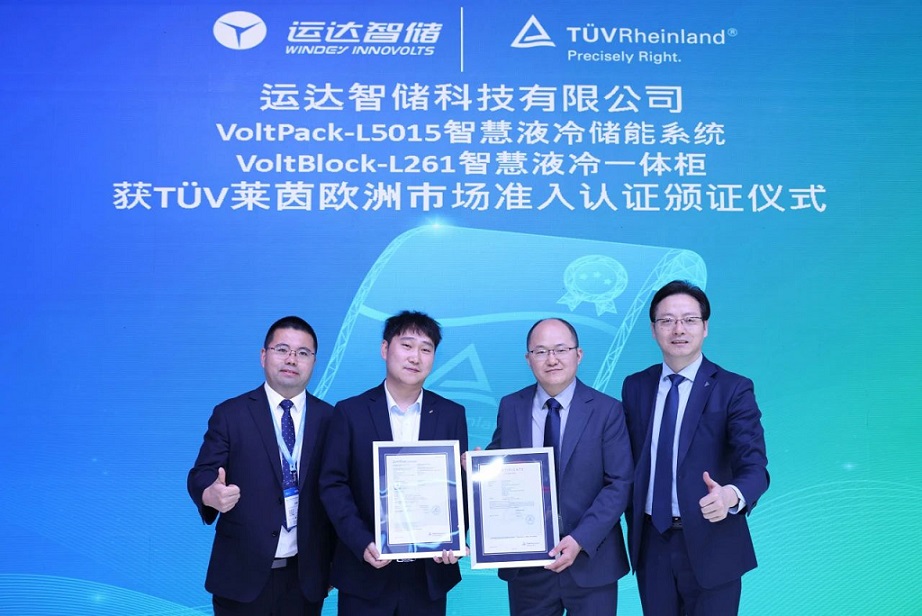 近日,运达股份旗下品牌——运达智储与德国莱茵TÜV集团在第十三届储能国际峰会暨展览会(ESIE 2025)现场联合举办认证颁授仪式,运达智储旗下VoltPack-L5015智慧液冷储能系统与VoltBlock-L261智慧液冷一体柜成功通过IEC62477、IEC62619、UL9540A等欧盟严苛认证,标志着运达智储在全球储能领域的技术实力与安全标准再攀新高,为加速海外市场布局注入强心剂。