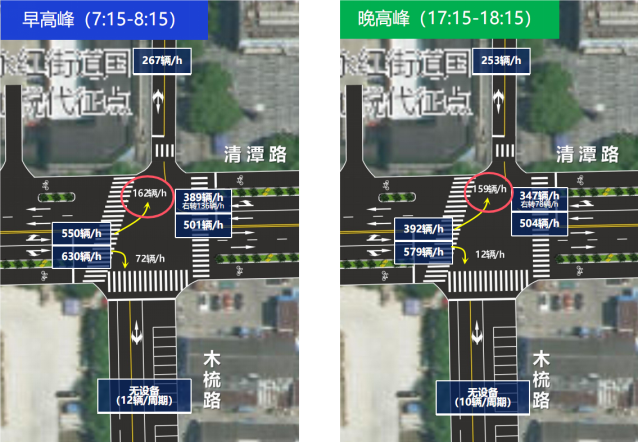 通过分析研判该路口的流量,早晚高峰时段均以东西直行车辆为主;同时,东西直行有潮汐现象,早高峰以西向东进城为主,晚高峰以东向西出城为主。
