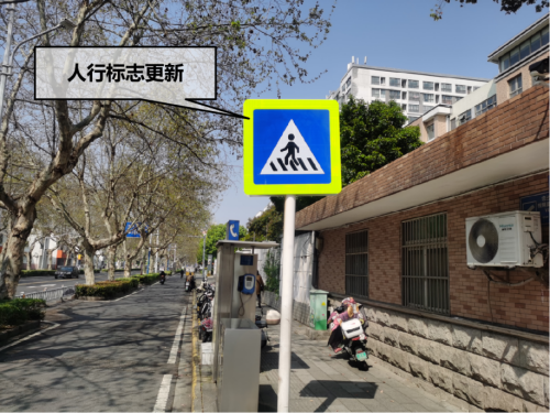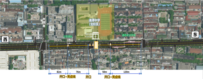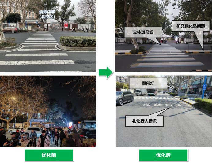 改造学校正门对面的绿化带,保障充足的过街空间;设置立体斑马线和礼让行人标线;增设行人过街横道标牌及爆闪灯。