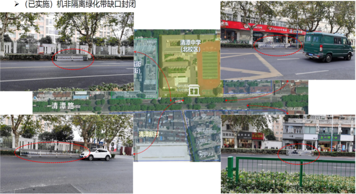 为了防止接送学家长将非机动车随意停放在机动车道上以及非机动车随意过街影响干线通行等情况,使用护栏封闭学校周边的四处绿化带缺口,提升学校周边的非机动车停放和运行秩序。