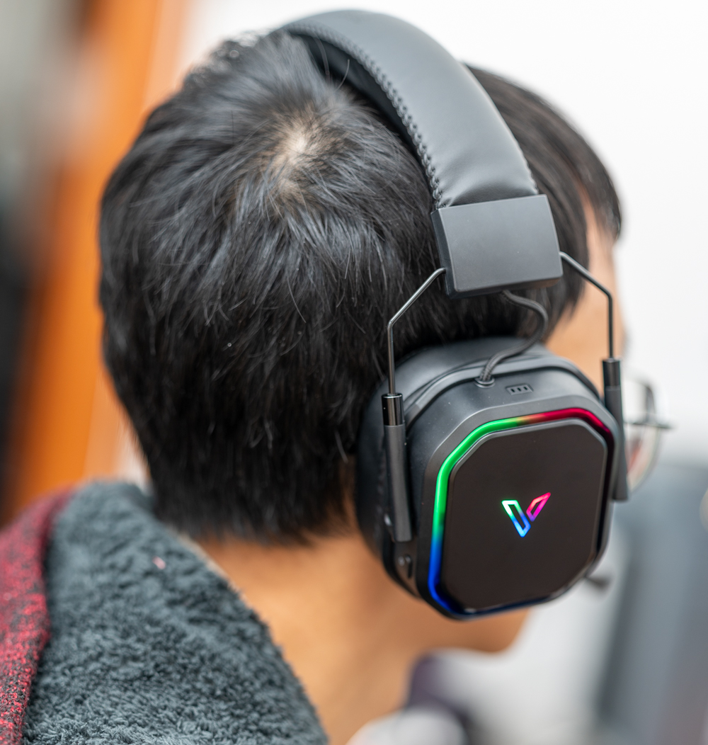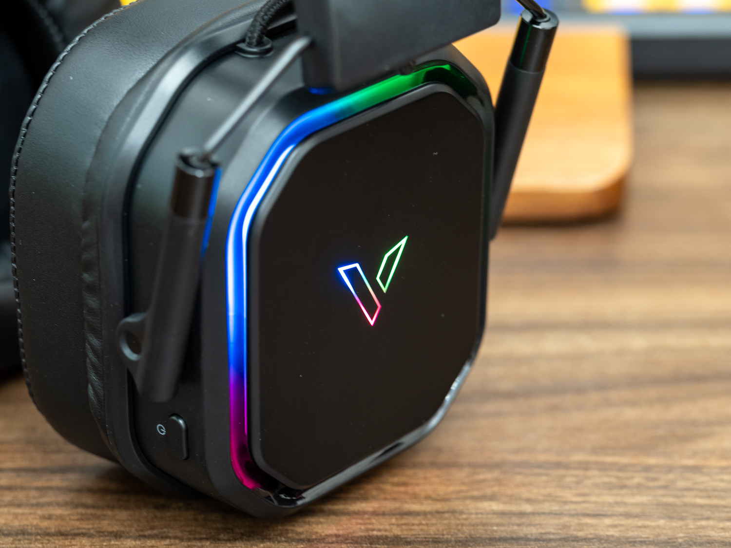 耳机外壳有雷柏的logo,打开电源之后可以看到围绕雷柏logo和外壳周围一圈的RGB灯效,在反射的效果之下灯光效果更加柔和,光效看起来也非常高级。