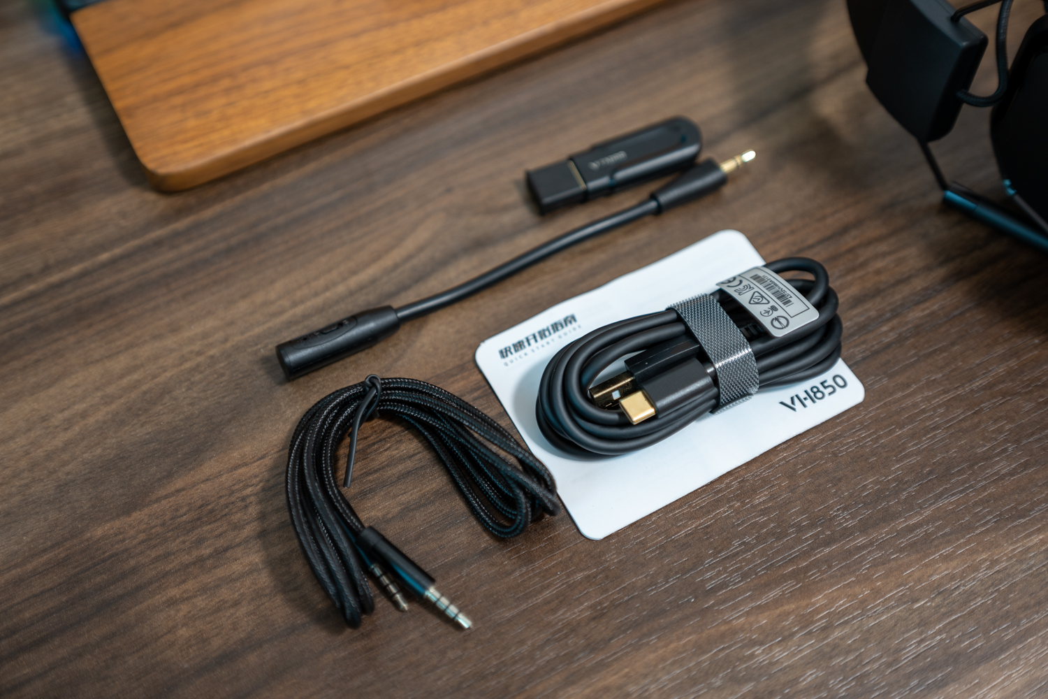 配件盒里有一个2.4G接收器、长杆麦克风、3.5mm音频线、Type-C数据线、快速开始指南,也就是支持2.4无线、有线连接两种模式的硬件,还有一个是蓝牙无线。
