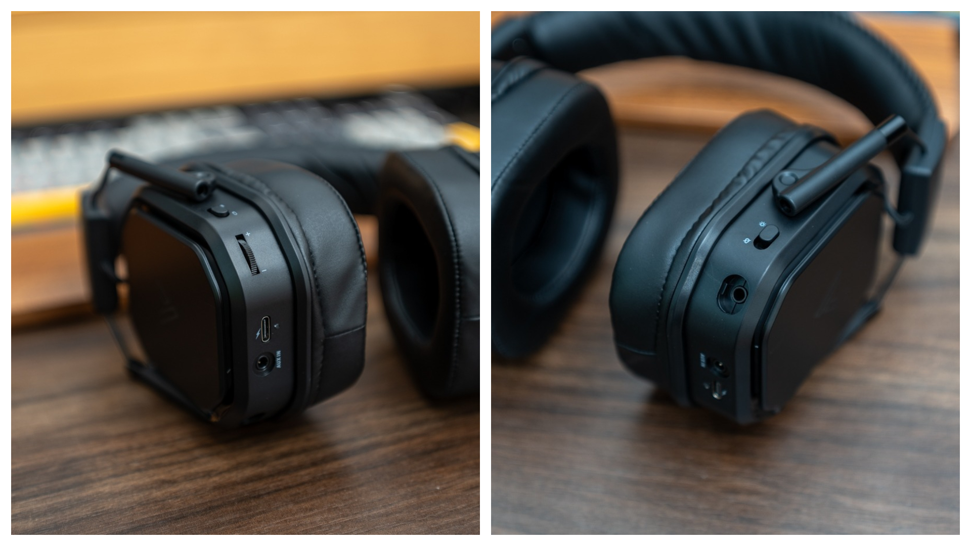 耳机左右两侧的功能、接口、按键也非常多,左侧有模式切换,可以切换2.4g和蓝牙模式,还有音量调节旋钮,Type-C充电接口,3.5mm音频接口、灯光开关。另一侧有一个电源开关,也就是大多数功能集中在左侧了,方便调节。