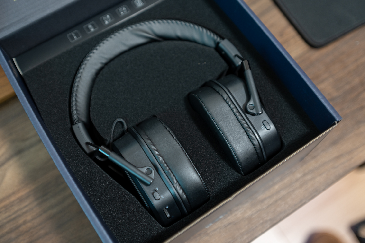 打开盖子给我一种高级感,黑色皮质和光影的配合,感觉整个耳机有种皮革包裹的高级感,耳机本身也是比较大的,顶部有配件盒。