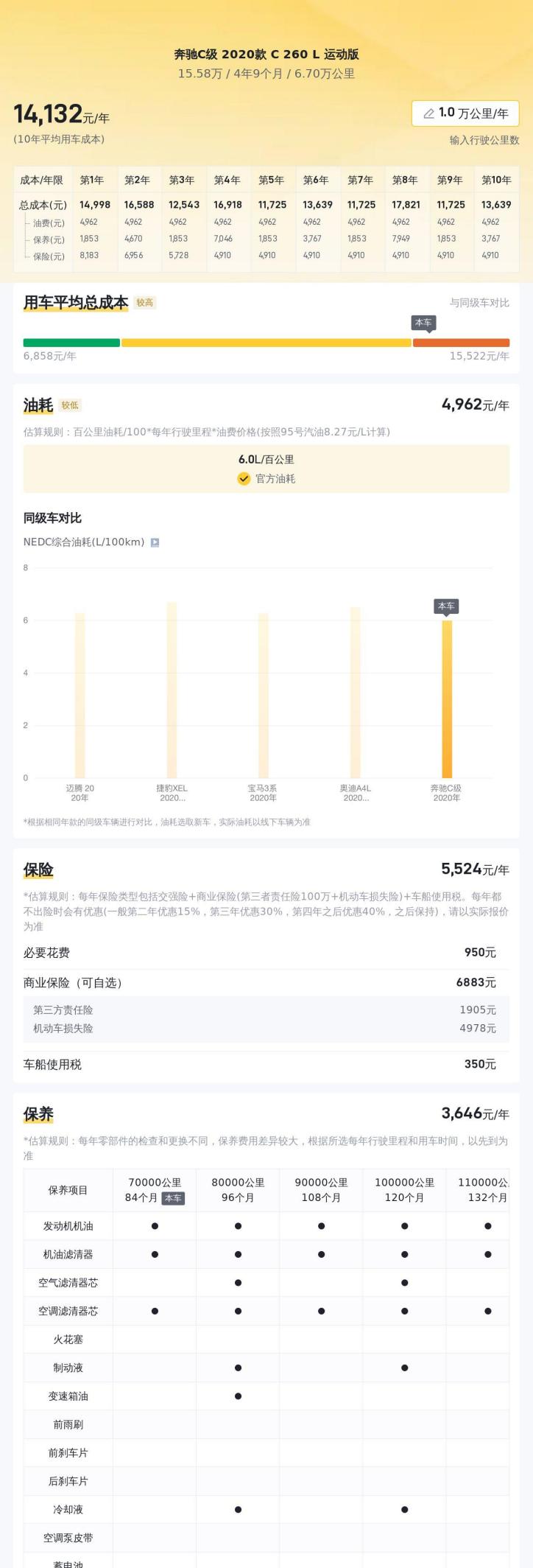 在用车成本方面,根据测算,这辆二手奔驰C级的10年平均用车成本约为14,181元/年,其中包括油费、保养费、保险费等。这个成本在同级别车型中处于中等水平,不算高,也不算低。当然,实际用车成本还会受到个人驾驶习惯、使用频率等因素的影响。