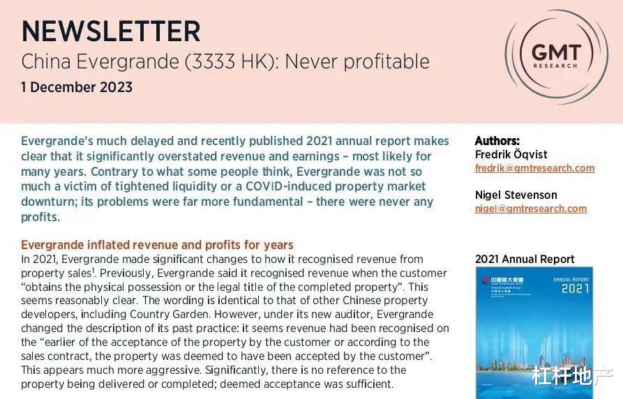 彼时做空机构GMT Research发布一篇报告,翻译过来叫《恒大从未盈利》,其中提到“与其说恒大是流动性收紧或疫情引发的房地产市场低迷的受害者,不如说它可能从来没有产生任何利润。”