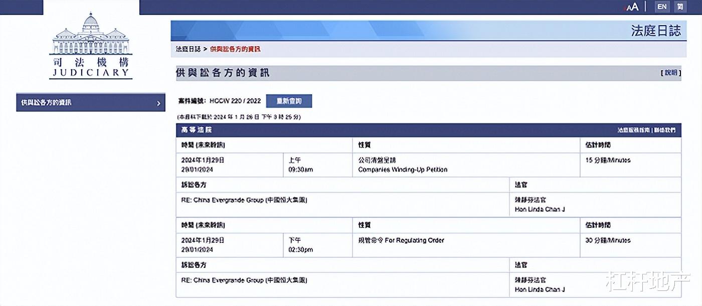 1月26日,据香港司法机构网站,香港高等法院将于2024年1月29日9时30分举行针对中国恒大集团的清盘呈请聆讯。法官陈静芬将于下周一下午2时30分就一项潜在的规管命令举行聆讯。据了解,此类规管令意味着法院将监管清盘程序,可能包括任命清算人。
