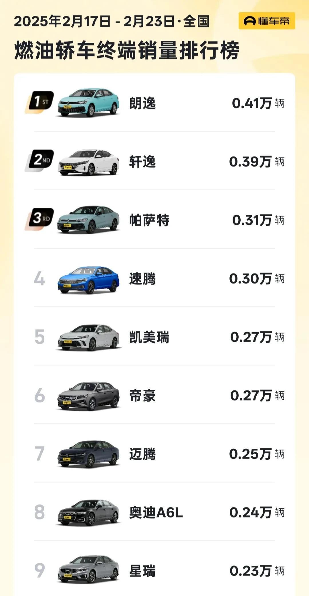 我们先来看看这份榜单。朗逸以0.41万辆的销量领跑,轩逸以微弱差距紧随其后,帕萨特、速腾也表现不俗,都超过了0.3万辆。凯美瑞、帝豪则在0.27万辆左右徘徊。迈腾、奥迪A6L也分别以0.25万辆和0.24万辆的成绩稳居前十。值得注意的是,曾经的销量常青树卡罗拉,如今却只卖出了0.2万辆出头,排名更是跌至第十一名。曾经风靡一时日系三杰:天籁、凯美瑞、雅阁,如今只有凯美瑞还在苦苦支撑,其余两位的处境都颇为尴尬。