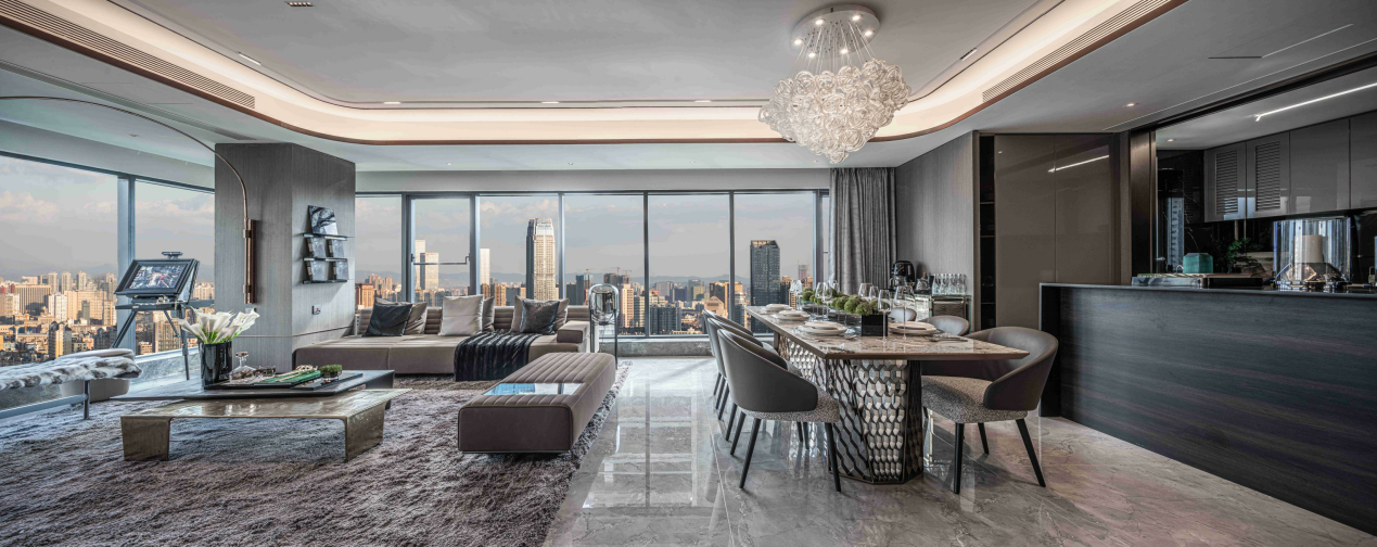 搭配盘龙江灵动的江水,项目外立面做了经典的三段对称式,以灰蓝白色调为主,大面积双层中空LOW-E玻璃、甄选珍贵石材和高阶材料,配以金属线条,让建筑整体显得挺拔、轻盈、有层次,在第一眼感官上就收获时尚、现代、有格调、有品质的视觉享受。