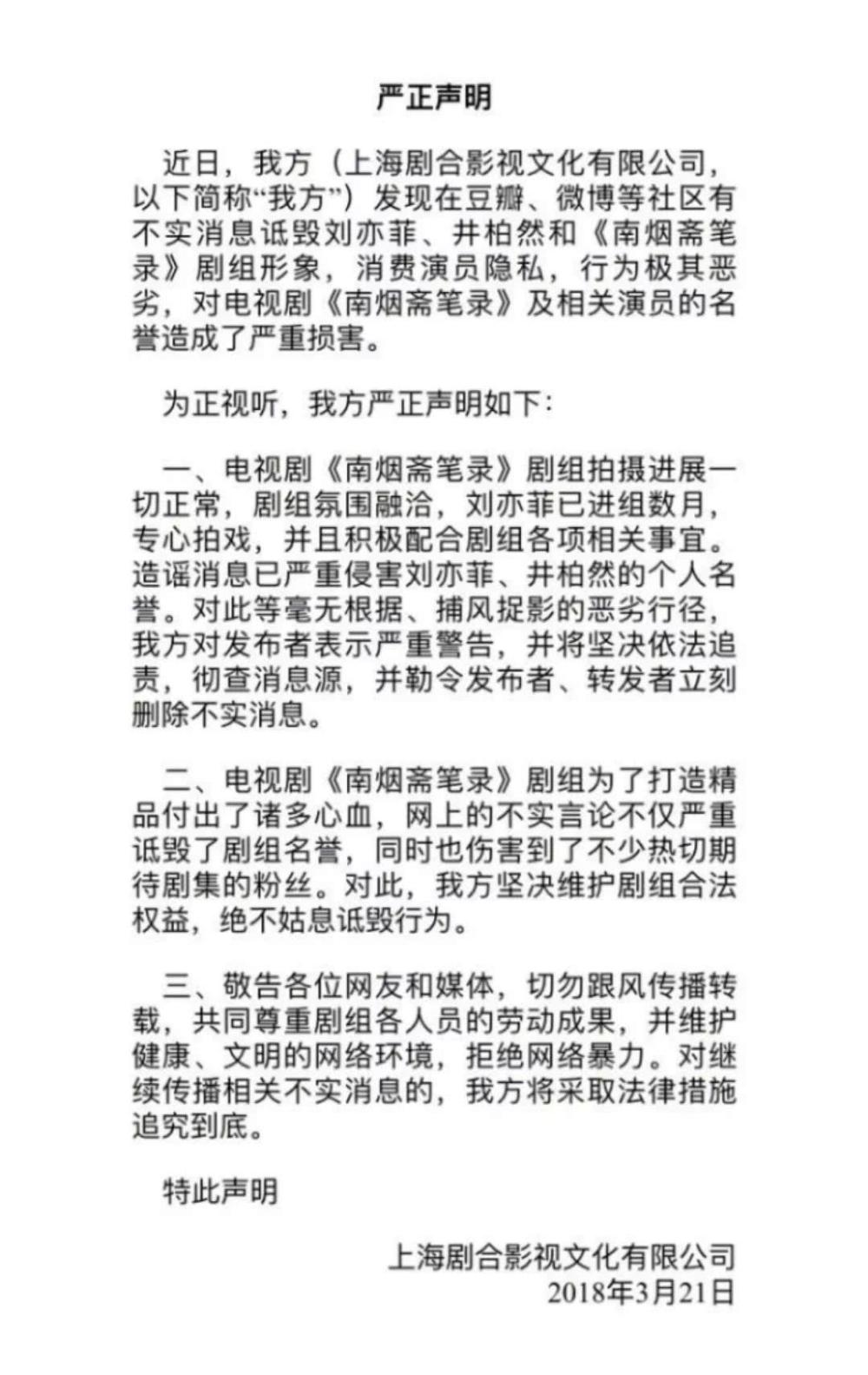 《南烟斋笔录》剧组同样也发了声明,谴责这些不实消息,坚决维护刘亦菲井柏然这两位演员的名誉。