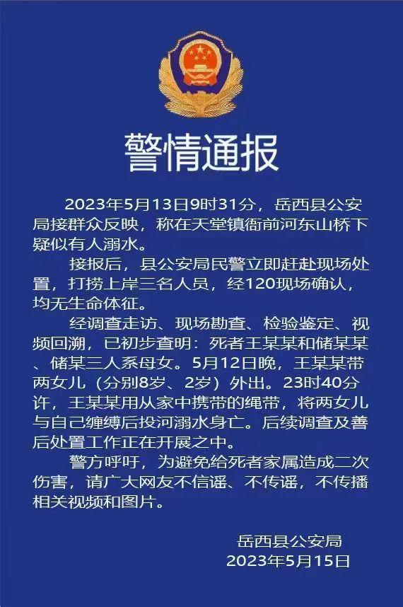 5月12日晚,安徽安庆岳西县天堂镇一女子王某某带分别8岁、2岁的两女儿外出,当晚11时40分许,王某某用从家中携带的绳带,将两女儿与自己缠缚后投河溺水身亡。5月16日,岳西县委宣传部相关负责人表示,王某某于2020年离婚,后与前夫一起生活,目前尚无证据证明跳水溺亡前存在家庭纠纷。