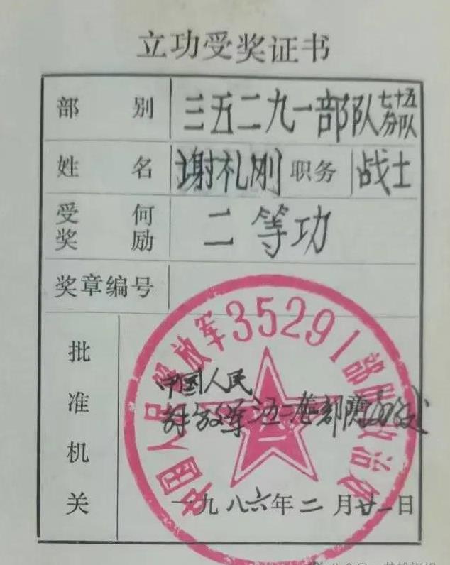 上图:谢立刚的立功证书(资料提供:谢立顺)