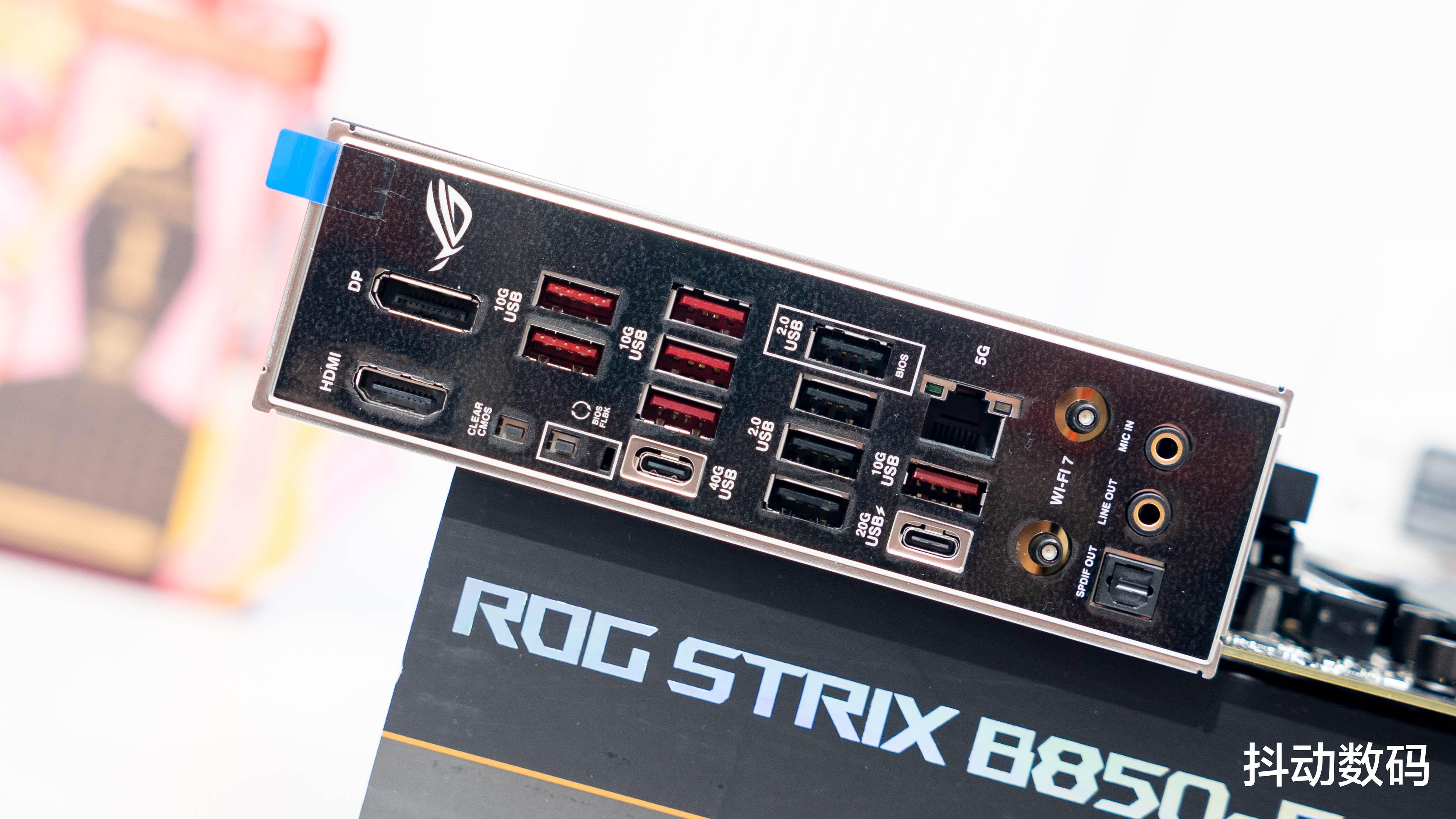 IO扩展方面多达10个的USB-A接口,其中6个红色的USB-A接口还是支持10Gbps传输的,此外支持40Gbps传输的USB 4.0的Type-C接口也有一个,还有一个20Gbps的Type-C接口方便扩展。网络方面一步到位提供了一个5G的RJ45网卡和Wi-Fi 7无线网卡的组合,相信2025年也会是玩家全面进入万兆带宽的一年。