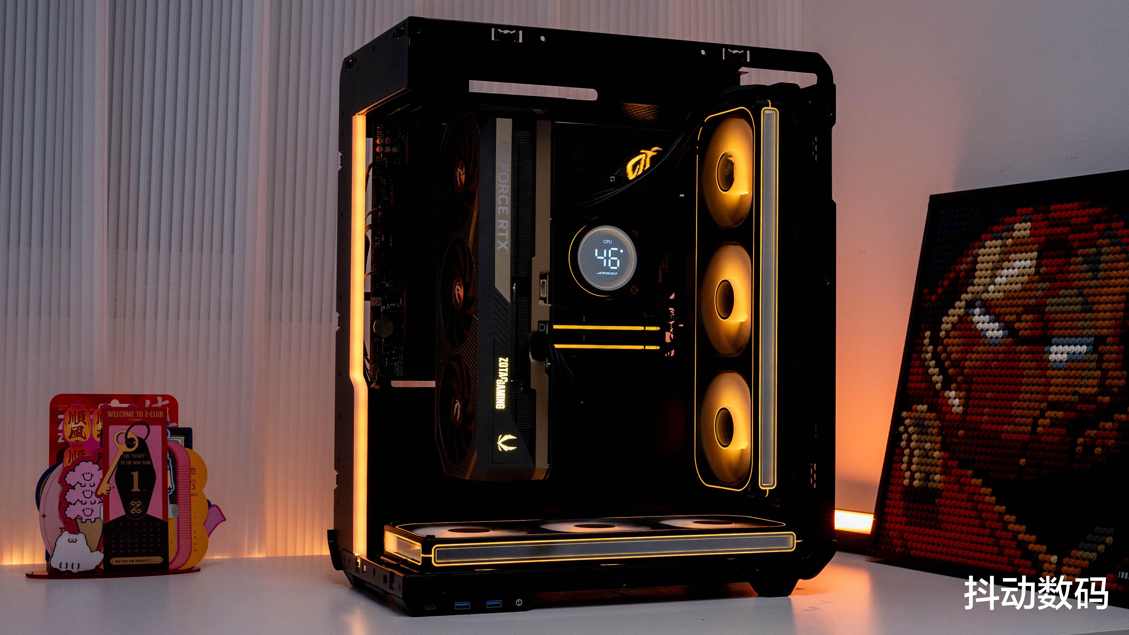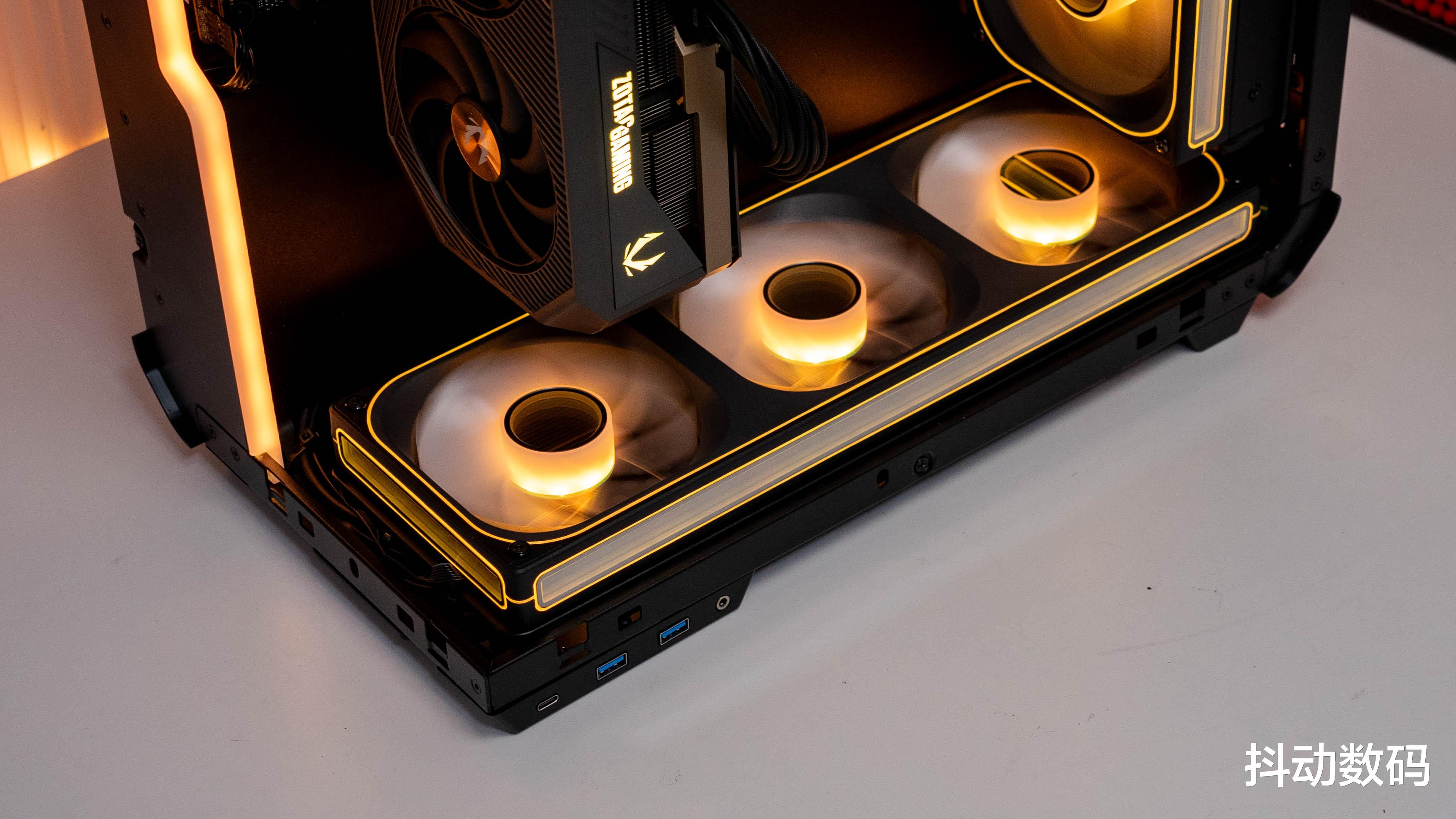 拆下玻璃后内部效果展示,显卡如果换成索泰侧面也有大面积灯光效果的RTX 5080 16GB AMP EX IN显卡估计整体会更炫酷。
