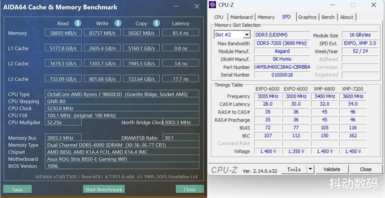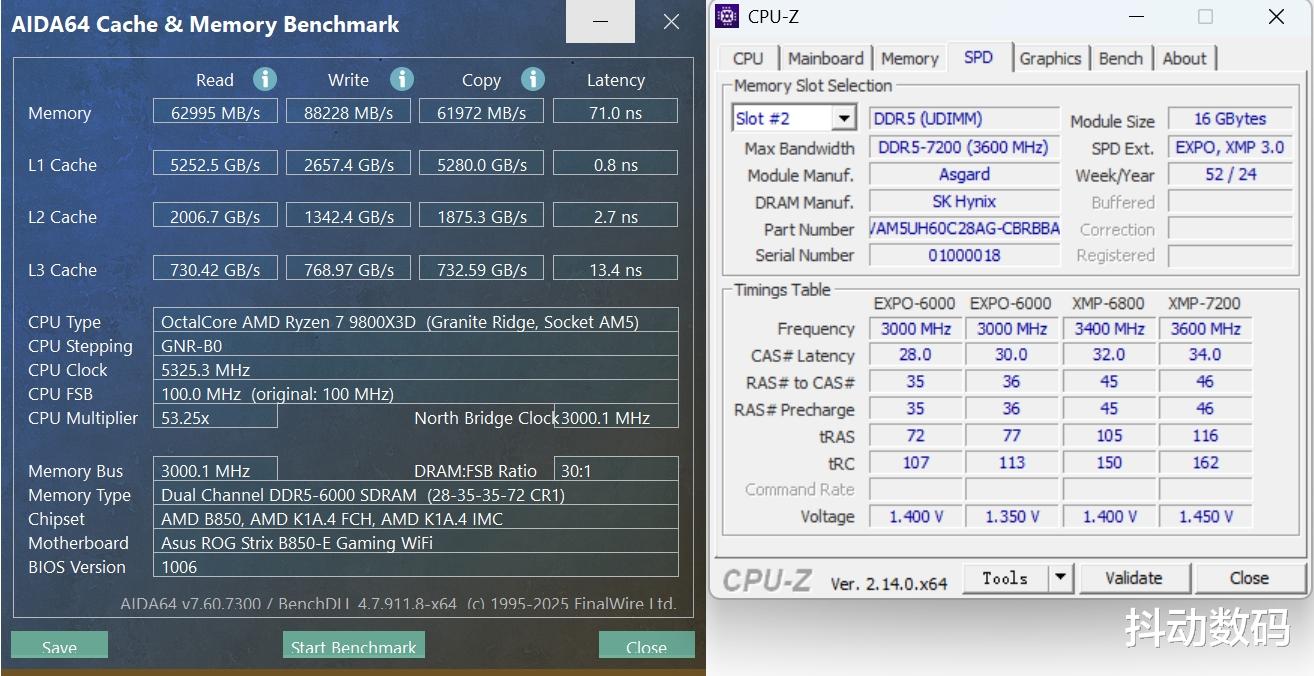 手动设置开启EXPO Tweaked选项6000MHz CL28后,==AIDA64 内存读写测试延迟如图,延迟有明显降低,而且读写整体都提升。默认下6000MHz CL28对于AMD平台绝对是甜点级的存在。