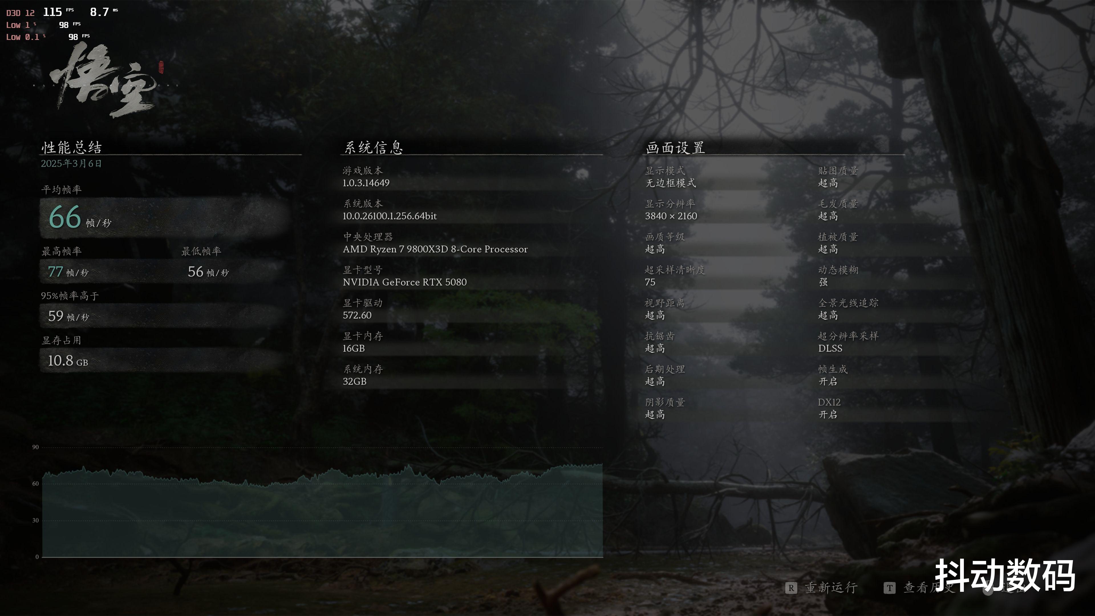 「黑神话悟空」游戏在4K分辨率下,开启全景光线追踪超级后。超级采样率为75的情况下游戏平均帧数66帧,最低帧数56帧。