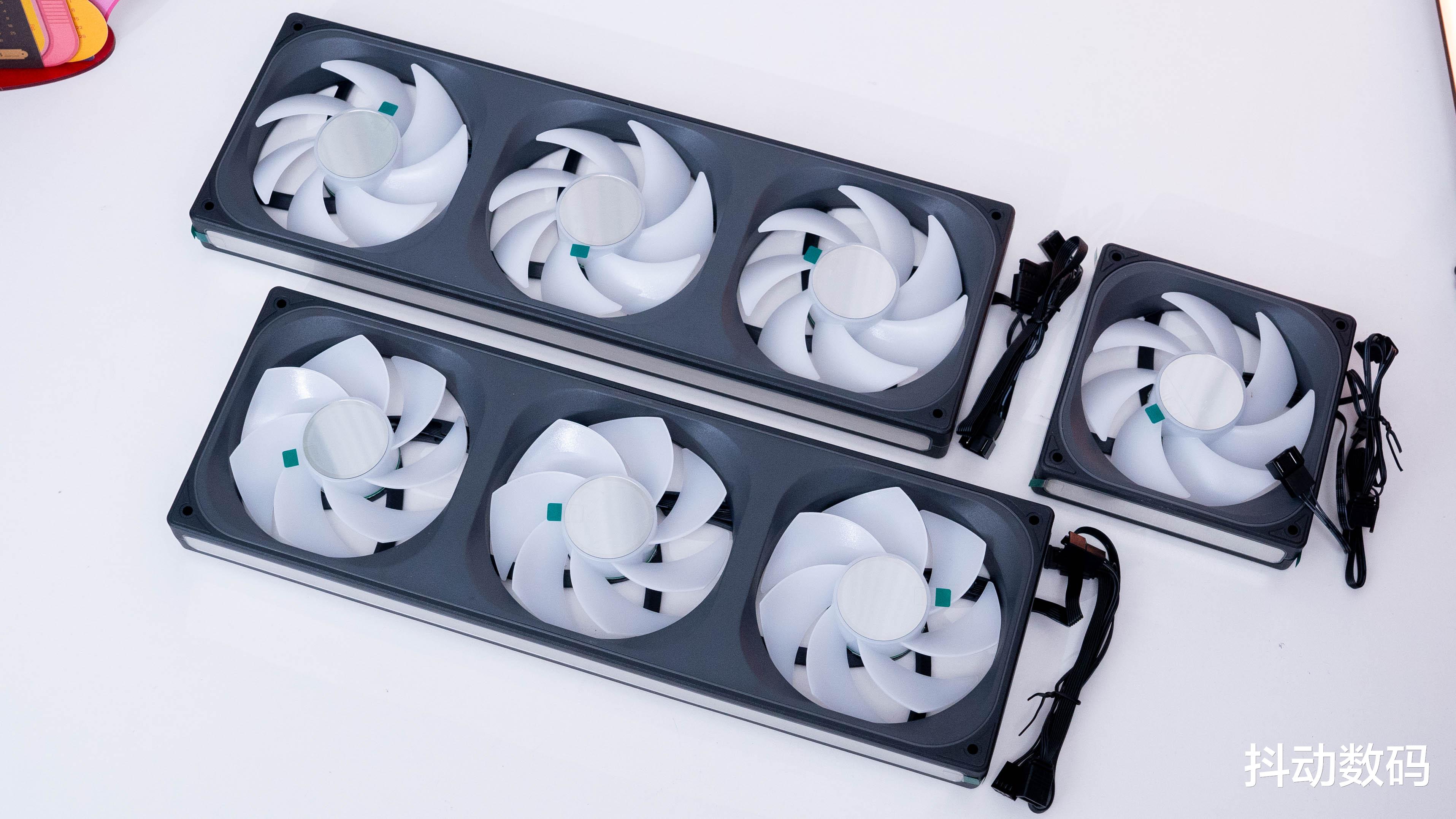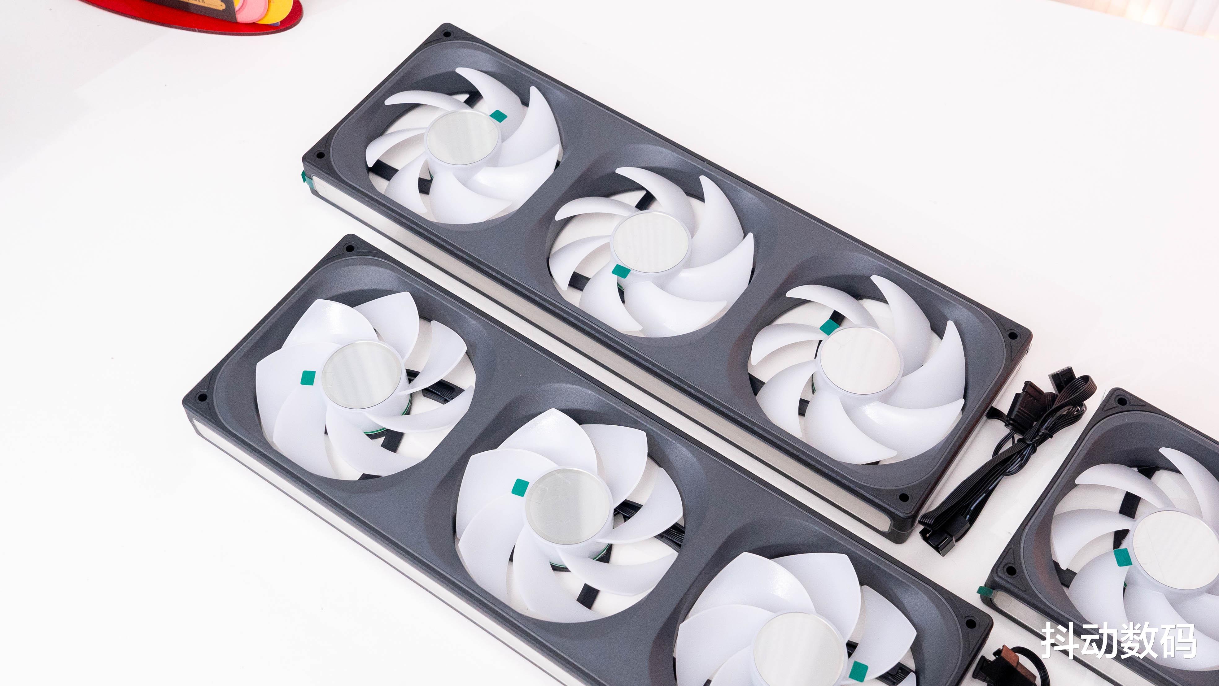 联体的360mm风扇设计了三把9叶风扇。整体外观为黑色设计,噪声21.3-37.3dB(A),转速700-2400RPM ±10%,风量21.46-62.40CFM。