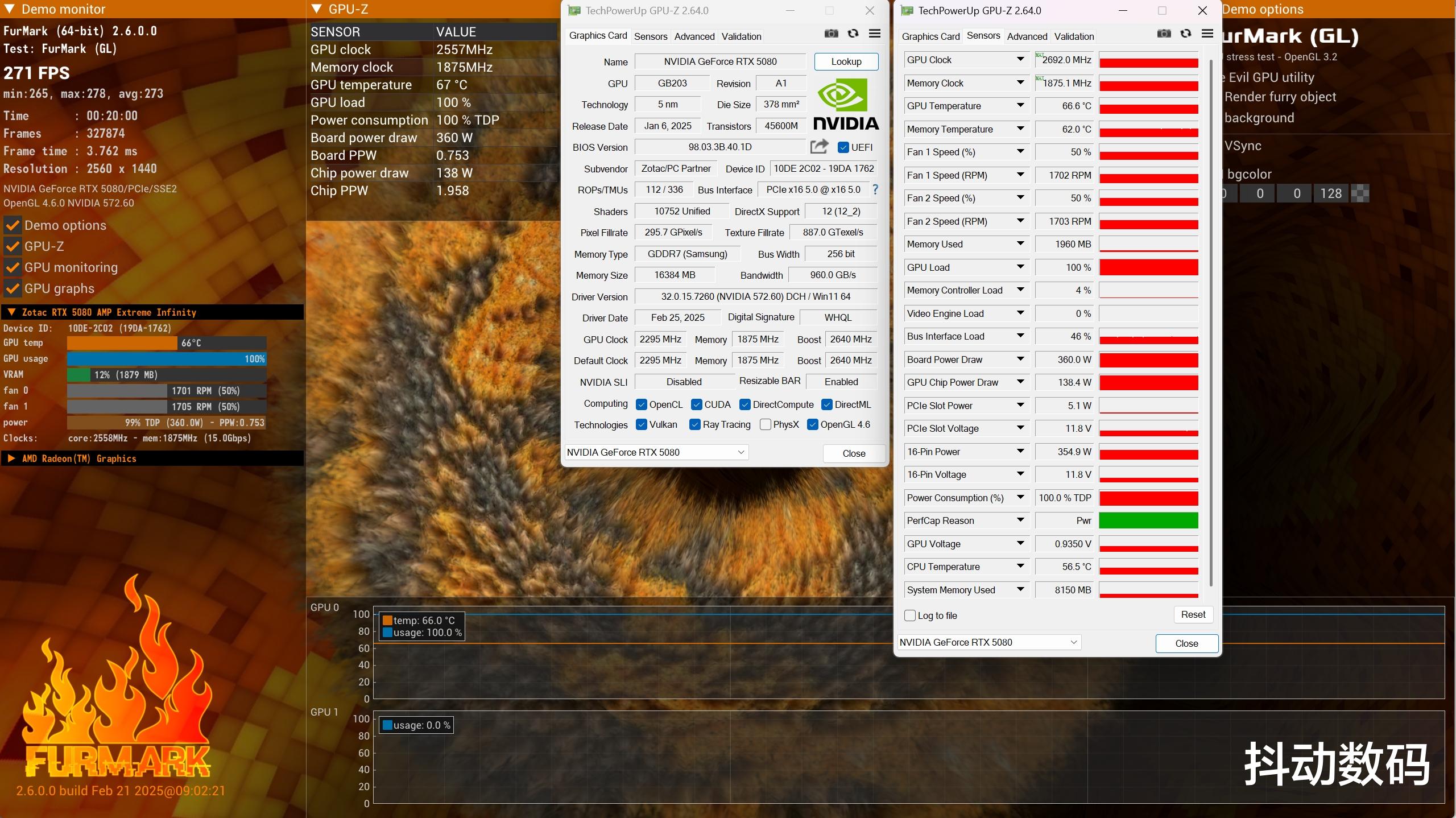索泰RTX 5080 16GB SOLID OC 显卡的甜甜圈烤机测试,显卡频率2557Mhz,显卡核心温度67℃,显存温度62℃。