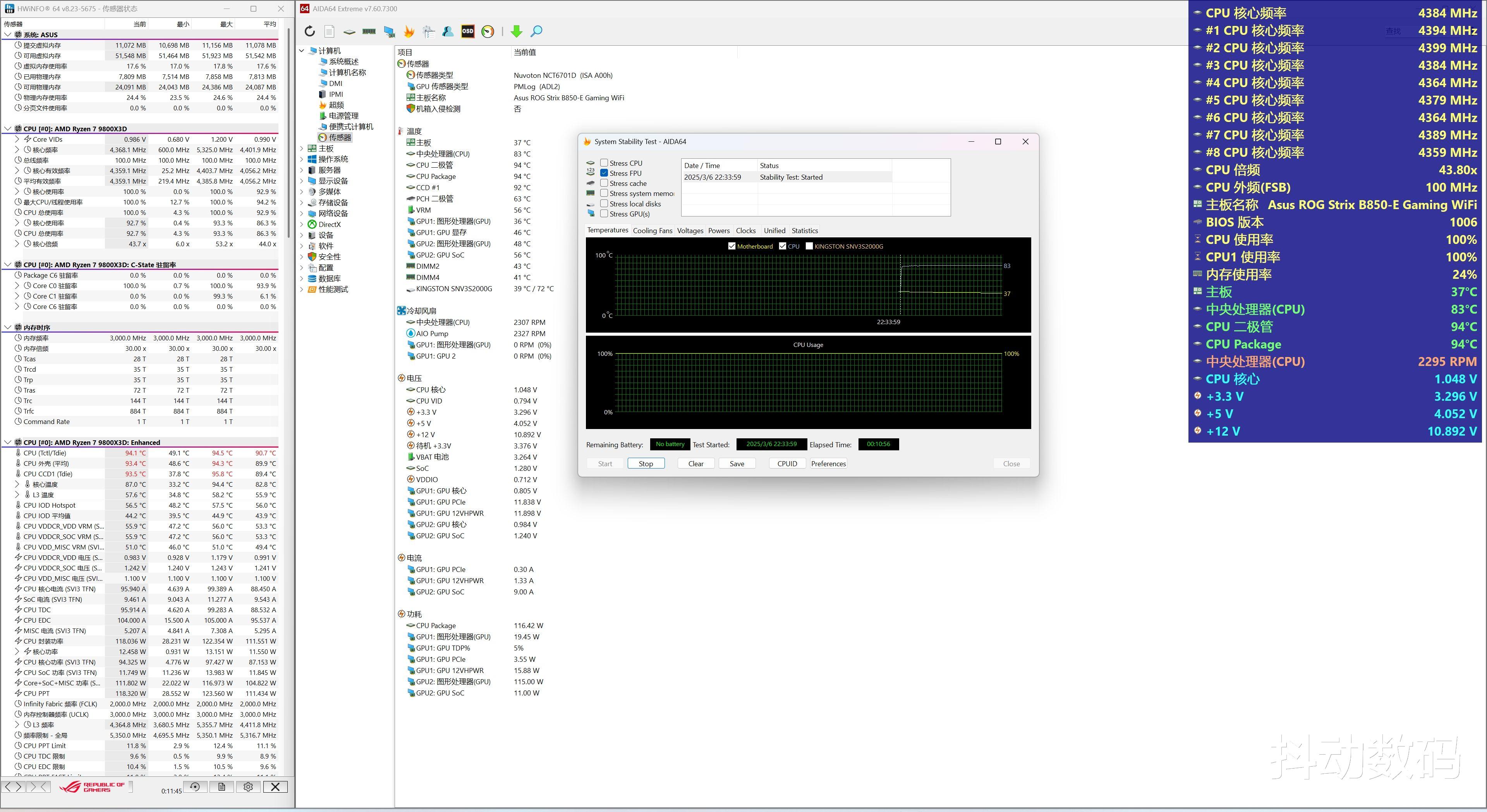 9800X3D的AIDA64 处理器压力测试,9800X3D核心频率4.4GHz,温度94℃。