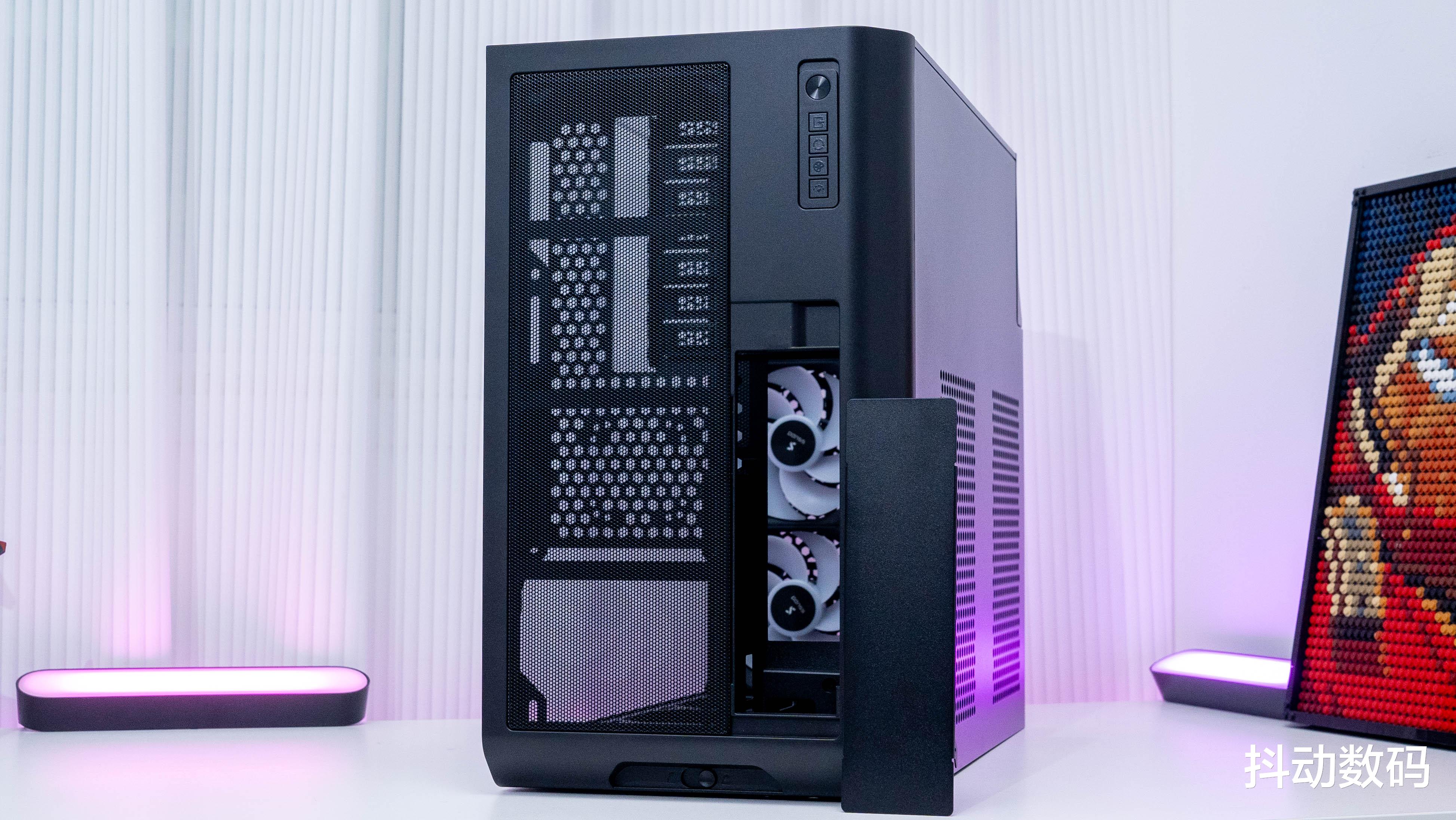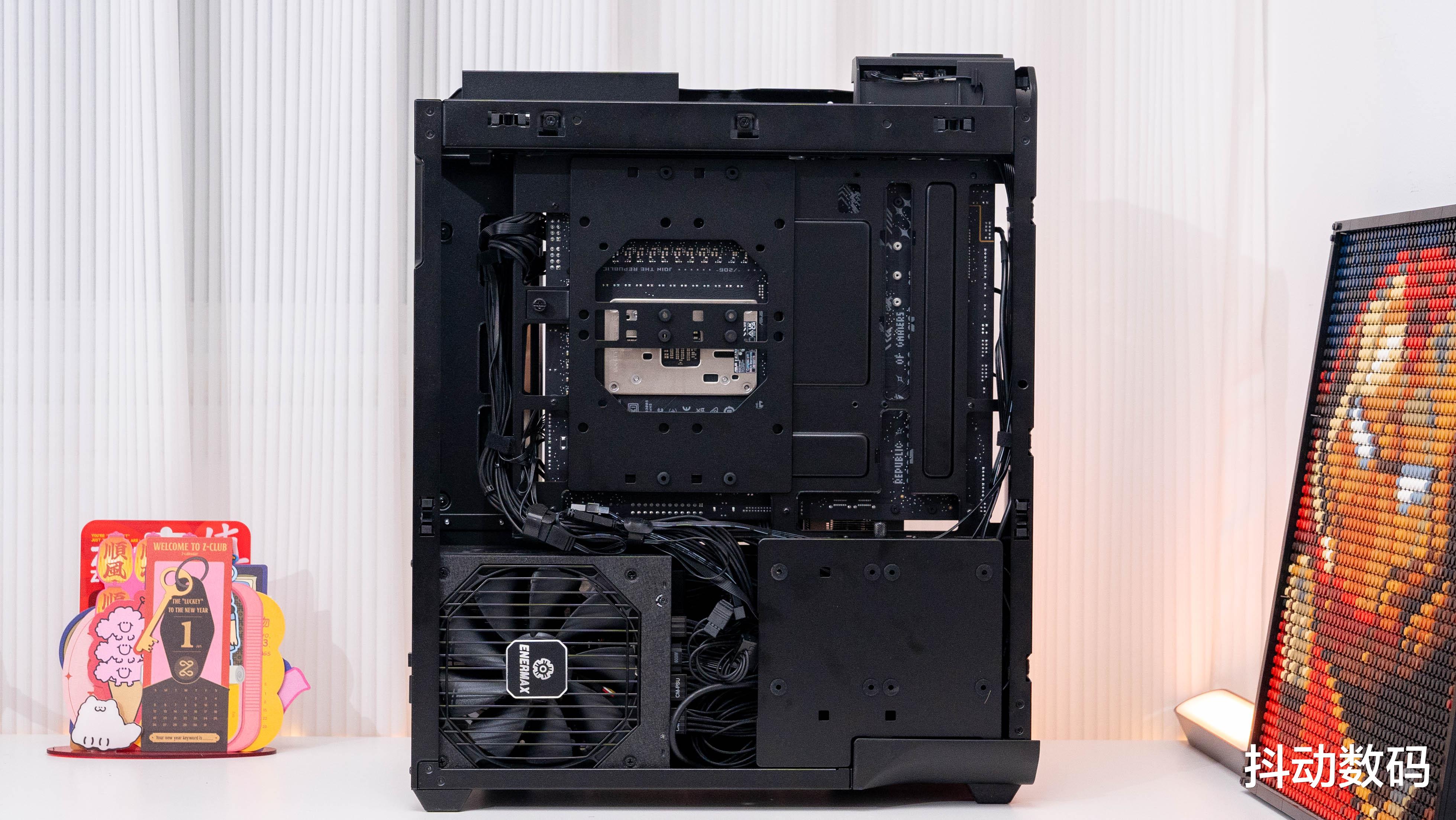 机箱内部可以安装两个360mm冷排,内部结构相比现在流行的海景房机箱还是有蛮多创新的地方的。而且考虑到垂直风道设计,主板IO在机箱顶部也预留了理线与方便IO插拔的设计巧思。