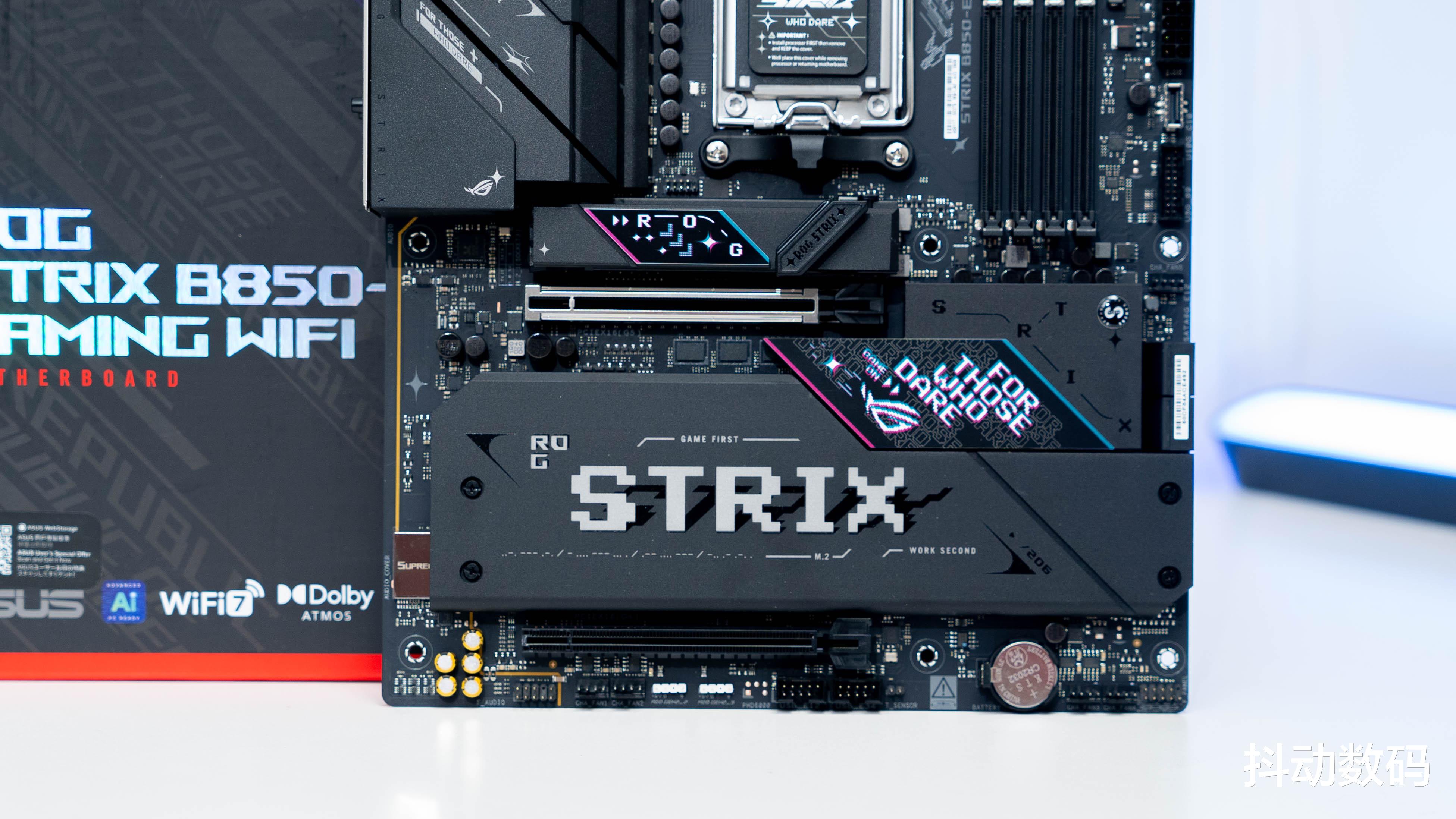 主板是华硕ROG STRIX B850-E GAMING Wi-Fi主板,这款主板也是华硕在去年更新的B850芯片组的旗舰产品了,大面积的散热装甲点缀下都让你不能忽视它的配置参数。