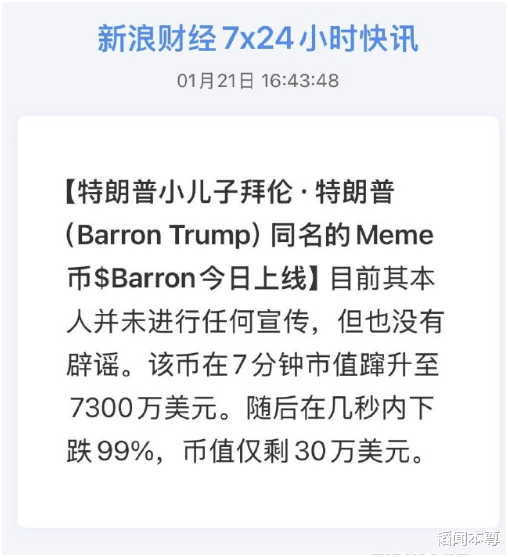 于是,特朗普的小儿子巴伦(又译拜伦)也发布了自己的加密货币,而且最高市值曾在短时间内上涨到7300万美元。