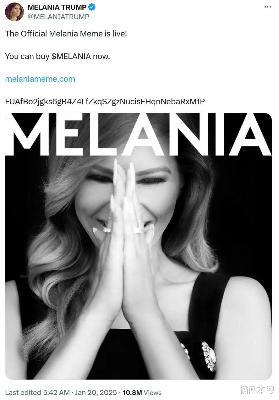 1月20日,随着“特朗普币”的火爆,特朗普的妻子梅拉尼娅在社交媒体X上宣布发布“梅拉尼娅币”。