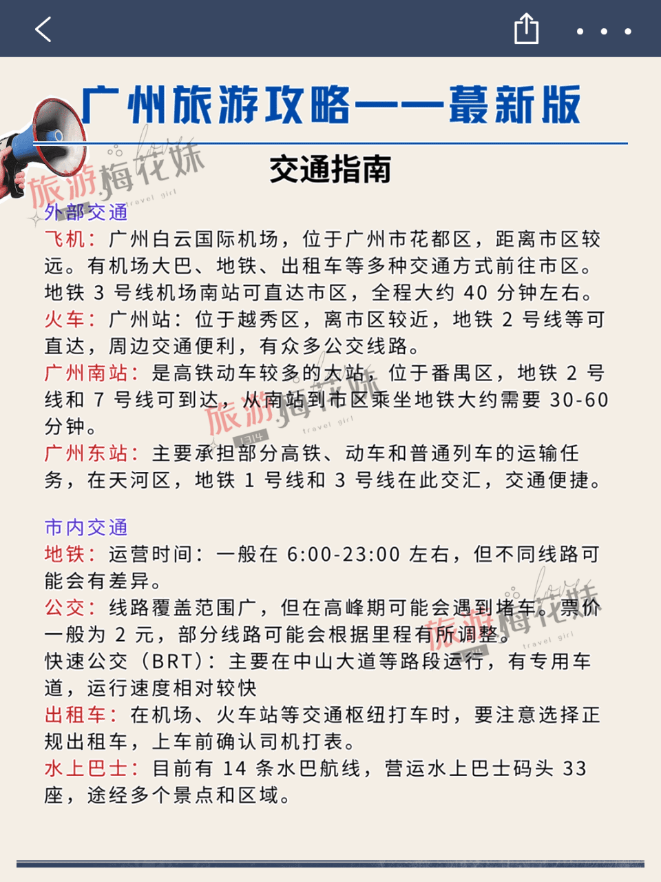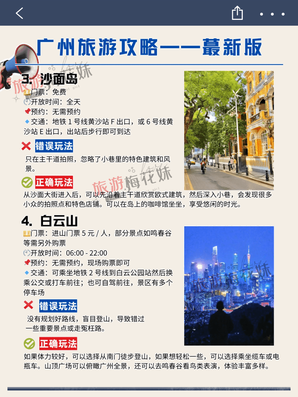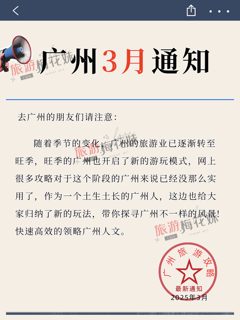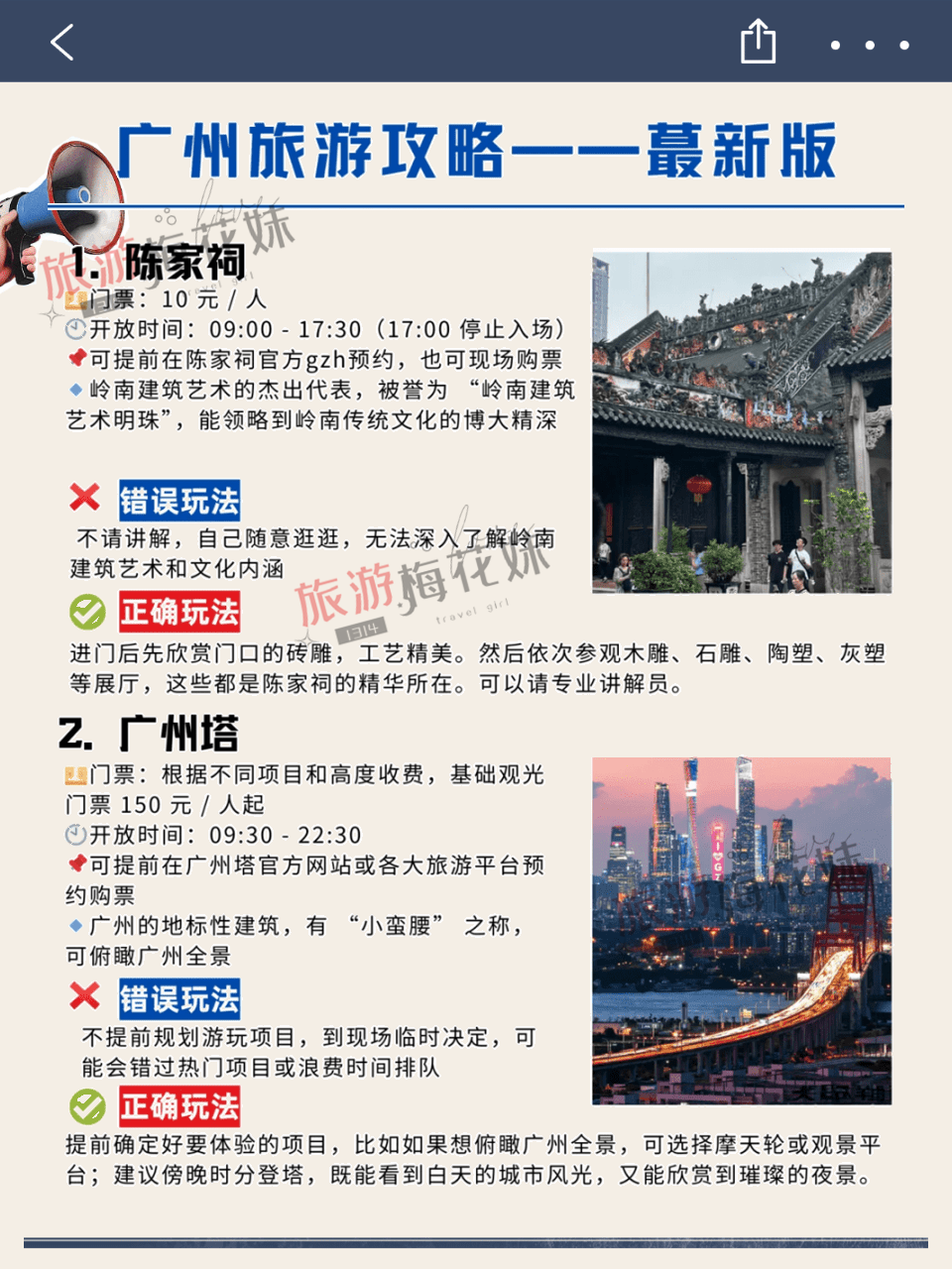 广州春季最强攻略!深度游玩解锁隐藏款打卡地作为一个土生土长的广州本地人,想和大家分享春季广州旅游最强攻略,带你玩转这座充满活力与文化底蕴的城市!🏛️ 精选景点打卡1⃣ 陈家祠堂 | 门票10元🕐 开放时间:09:00-17:30(17:00停止入场)📌 必看精华:门口砖雕、木雕、石雕、陶塑等精美工艺展厅🚫 错误打卡:盲目乱逛,错过岭南建筑艺术精髓✨ 正确玩法:先欣赏门口砖雕工艺,按展厅顺序参观,建议请专业讲解员深度了解2⃣ 广州塔 | 门票150元起🕐 开放时间:09:30-22:30📌 预约提醒:建议提前在官网或旅游平台预约🚫 避坑指南:临时决定游玩项目容易错过热门时段✨ 打卡建议:提前规划要体验的项目,傍晚时分登塔,既能看日落也能欣赏夜景3⃣ 沙面岛 | 免费🕐 开放时间:全天📍 交通:地铁1号线或6号线黄沙站E出口✨ 深度玩法:从沙面大街进入,漫步欧式建筑街区,探索小巷拍照点和特色店铺,建议在岛上咖啡馆小憩4⃣ 白云山 | 门票5元起🕐 开放时间:06:00-22:00📍 交通:地铁2号线到白云公园站✨ 登山攻略:体力好的可选择南门徒步,想轻松可乘坐缆车,山顶还可以观看鸟类表演5⃣ 越秀公园 | 免费🕐 开放时间:06:00-22:00📌 特色:五羊石像、镇海楼等标志性景点✨ 游览建议:从正门进入,先打卡五羊石像,再去镇海楼了解广州历史文化6⃣ 广东省博物馆 | 免费(需预约)🕐 开放时间:周二至周日 09:00-17:00📍 交通:地铁3号线珠江新城站B1出口步行500米✨ 参观建议:提前关注官网或公众号了解展览信息,建议先参观历史文化展厅🚇 交通攻略✈️ 白云机场:距市区较远,有机场大巴、地铁等多种交通方式🚄 广州站:位于越秀区,地铁2号线可直达🚉 广州南站:位于番禺区,地铁2号线和7号线可到达🚊 地铁:运营时间一般6:00-23:00🚌 公交:覆盖广泛,票价2元起🚖 出租车:在机场、火车站打车要选择正规车辆📍 五天游玩路线D1:专车接送+入住酒店D2:越秀公园→中山纪念堂→北京路步行街→大佛古寺D3:圣心大教堂→沙面岛→永庆坊→陈家祠→海心沙公园→广州塔D4:顺峰山公园→沙湾古镇→清晖园→华盖步行街D5:古庙探访→岭南新天地→梁园→南风古灶→返程💝 暖心提示:• 第一次来广州的集美们跟着这条线路走绝对没问题• 带家人或小朋友游玩建议找靠谱的当地导游,能省心省力还能了解更多小众景点• 返程火车建议选17:30后,飞机选18:00后的航班• 酒店全程不换,让旅途更轻松惬意#广州旅游 #广州攻略 #广州必打卡 #广州五天游 #广州深度游