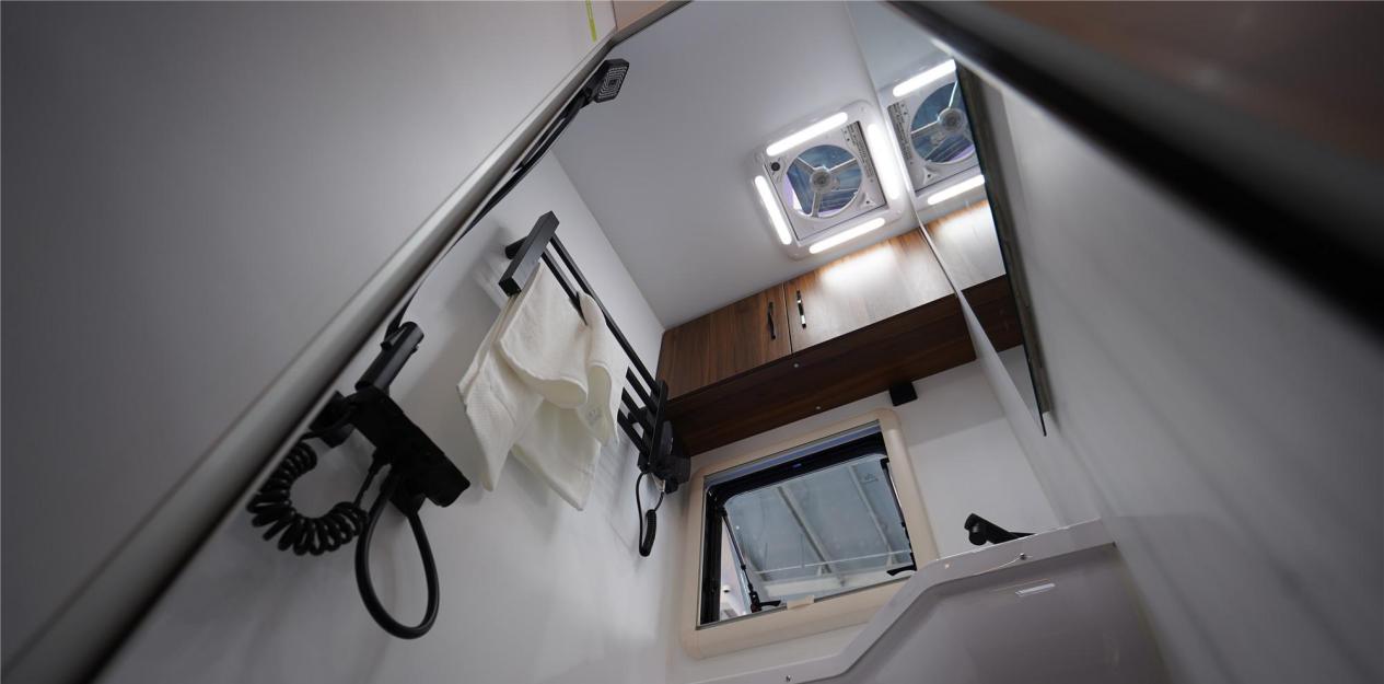 值得一提的是,卫生间的设计也势必会让你惊喜不已。巨信豪沃轻卡Pro房车的卫生间配备了固定式马桶与一体式花洒,并有双向换气扇保证空气流通。5000W恒温水暖一体机更是让沐浴变得舒适惬意,旅途中的洗澡也不会再成为一件尴尬的事情。