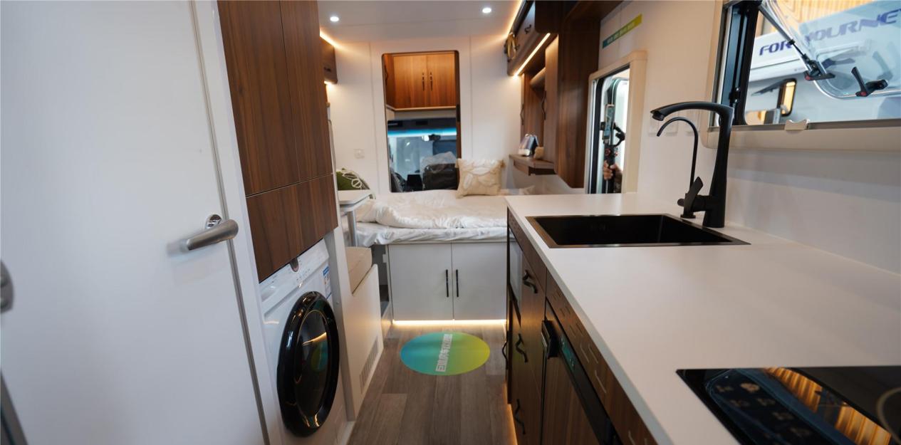 而在生活区和厨房区,它同样没有妥协,宽敞明亮的生活区配备了一台小米大1匹变频空调,确保车内空气的清新与舒适;厨房区则具备了电磁炉、侧吸式油烟机和大尺寸洗菜池等,几乎可以满足所有流动厨师的需求。更何况,微波炉和10KG洗烘一体洗衣机的配置,让旅途中的生活变得更加便利,毫不夸张地说,这款房车已不再是“移动的旅馆”,而更像是一个“流动的家”。