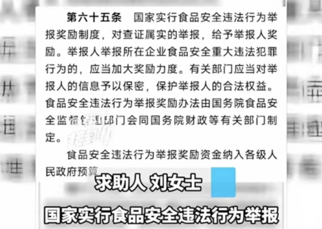 看到这里是不是大家都很懵啊!开口奖励5w,哪里来的依据呢?按照食品安全法赔偿1千元是合理合法的。刘女士的回复是:根据食品安全法实施条例第六十五条,对于这个违法行为举报奖励机制。这不得不说这个小姐姐还研究挺深的,但是上面没有写要奖励多少金额,并没有明确的金额。