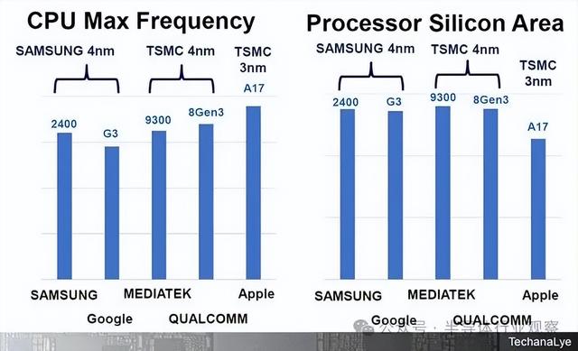 图8是上述五种芯片的最大频率和硅片面积的图表。与三星4nm产品相比,台积电4nm产品的频率更高,尽管高出几个百分点。采用3nm工艺的A17 Pro频率最高,同样采用3nm工艺的M3系列频率更高,超过4GHz。除了A17 Pro采用3nm制造外,面积几乎相同。它们是功能几乎相同的芯片,因此虽然细节上有差异,但从整体处理器芯片来看,三星和台积电几乎没有区别(我不会提及良率等)。高通和联发科采用3nm的产品即将发布,后续我们会继续进行对比。