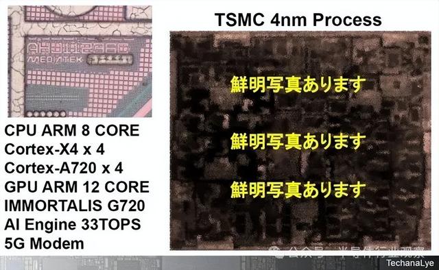 图 6显示了 Dimensity 9300 硅胶的开口。与高通的Snapdragon 8 Gen 3一样,它是采用台积电的4nm制造的。CPU配备8核,GPU配备Arm的G720 12核。虽然高通和三星有 3 层 CPU(高性能、中效、高效),但联发科天玑 9300 却“没有高效核心、4 个高性能核心、4 个中核心”,并且拥有高性能可见它具有重要的特征。AI引擎搭载联发科专有的“APU 790”,实现了33TOPS的计算性能。顺便说一句,联发科很少透露芯片上安装的晶体管数量,但天玑 9300 却宣称拥有 227 亿个晶体管。这个数字比苹果3nm处理器“A17 Pro”的190亿颗高出约20%。