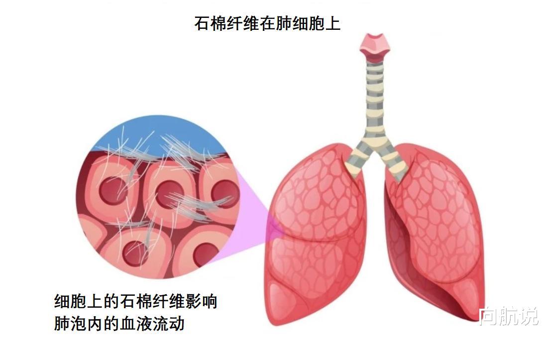 长期暴露于石棉纤维中会对人体健康造成严重危害,石棉纤维在悬浮空气中可持续存在,被人和动物吸入后在肺部沉积,长期存在于肺内,导致许多严重疾病。