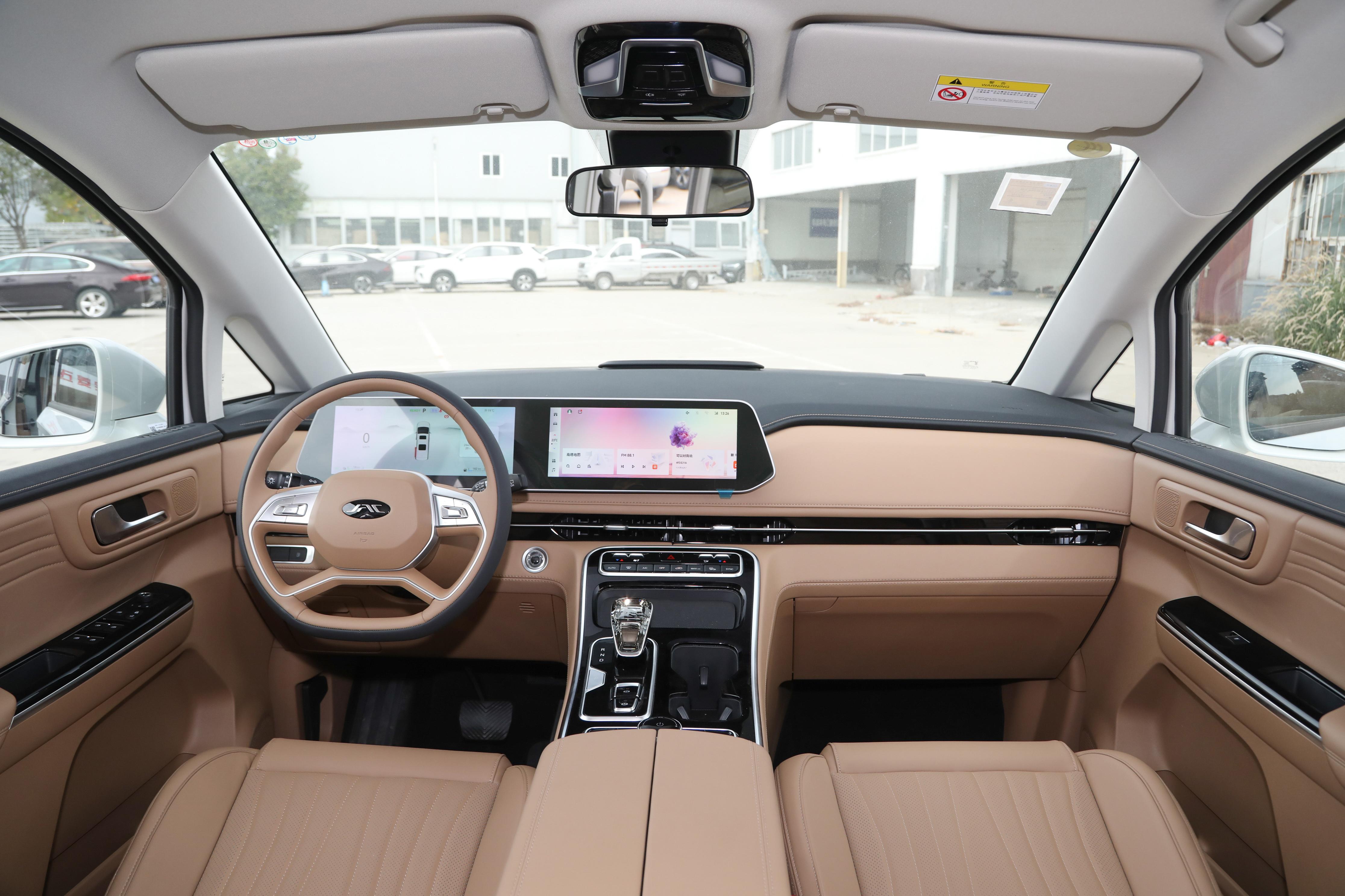 接下来看一下车内情况。瑞风RF8 PHEV的内装设计具有更多完整性显现,从中控台主体到挡杆控制区,绝大部分设计都以棕色皮料覆盖,且结构变化完整延续,直至中央扶手箱区间才出现断层,至于台体表面少量的黑色元素覆盖,仅以辅色身份点缀而已。硬件提升主要体现在质感上,采用真皮多功能方向盘设计,掌握控制转向时可获得更好的阻尼感,前方的全液晶仪表和中控屏以连屏的形式呈现,并且尺寸保持一致,均为12.3英寸,这一类的组合在现阶段的市场中已经较为少见,瑞风RF8 PHEV能够沿用此类设计还是挺让人眼前一亮的。