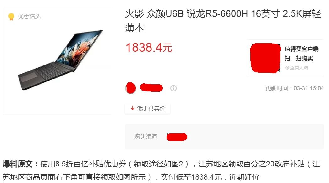 第一款是火影众颜U6B,它采用锐龙R5-6600H处理器,搭载16英寸2.5K+120Hz高刷高分屏,分辨率为2560x1600。PDD原价2698元,国补和百补后只要1838.4元。目前国补只限江苏区域,不知道往后会不会扩大区域。但张大妈没写容量版本,我去查了一下。