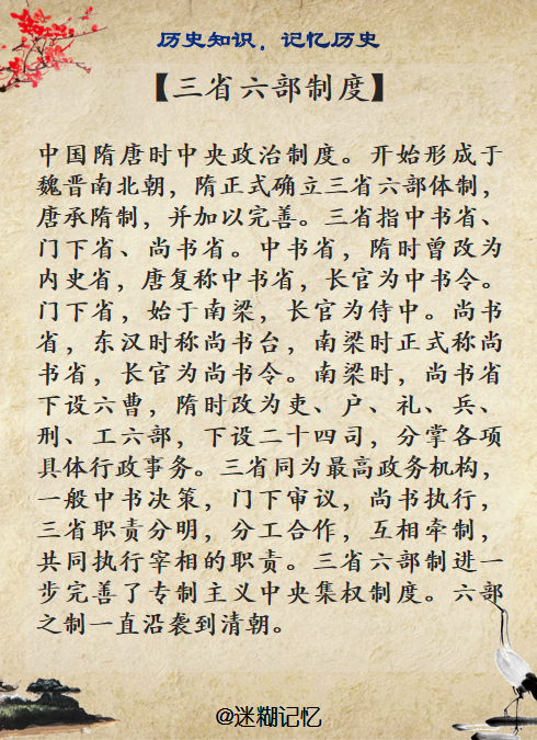 中国隋唐时中央政治制度。开始形成于魏晋南北朝,隋正式确立三省六部体制,唐承隋制,并加以完善。三省指中书省、门下省、尚书省。中书省,隋时曾改为内史省,唐复称中书省,长官为中书令。门下省,始于南梁,长官为侍中。尚书省,东汉时称尚书台,南梁时正式称尚书省,长官为尚书令。南梁时,尚书省下设六曹,隋时改为吏、户、礼、兵、刑、工六部,下设二十四司,分掌各项具体行政事务。三省同为最高政务机构,一般中书决策,门下审议,尚书执行,三省职责分明,分工合作,互相牵制,共同执行宰相的职责。三省六部制进一步完善了专制主义中央集权制度。六部之制一直沿袭到清朝。
