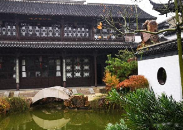 地在我来到二分明月楼的左前方,过石桥,堆有黄石大假山一座,石峰高达二层楼,下构石洞。过洞转折就来到夕佳楼,楼平面长方形,面阔有三间,而当心间敞开,露出楼里的黄石山壁,从室外走人室内,和环秀山庄的做法有些相近,室内地面做出水流觞道,是泛杯觞咏的地方。偏院内有石阶可爬上山顶与二楼楼面。楼北侧梢间内前面用粉墙围成一院,开月亮门两个,一左一右,好像一个明月分成两半,又和园名暗合。池角种桃树与迎春花。