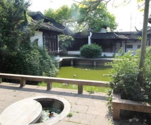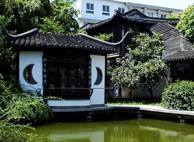 从夕佳楼左侧出来,有石板桥沟通池中水榭。榭平面为扇形,中间是用墙隔成前后两部分,榭半立岸上,半立水上,正面见四柱,中间开敞,设美园人靠,左右抱柱有联写道:荷风送香气,松月生夜凉。”次间用粉墙砌筑,卷中设月牙洞窗。临北槛北望,水面无风波不兴,杨柳垂袖听蝉噪。