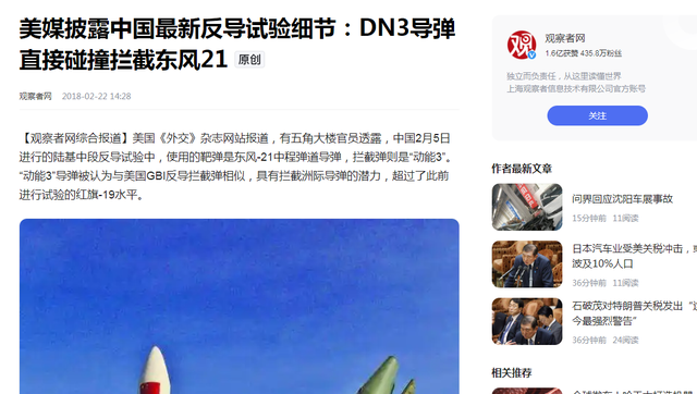 观察者网,美媒披露中国最新反导试验细节:DN3导弹直接碰撞拦截东风21