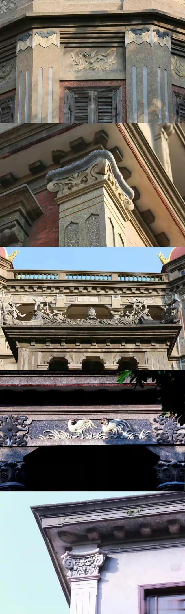 第三大特色:是一座用中国传统装饰工艺建成的别墅洋楼,全部梁、柱、楣、檐、板、角都饰有花卉、禽鸟等动植物浮雕,颇有乡土气息,而窗户又是欧式的,均装百叶。内部房间、厅堂的分置却是中西结合,既有中国传统的厢房和公用的中厅,又有欧式的壁炉和宽廊。