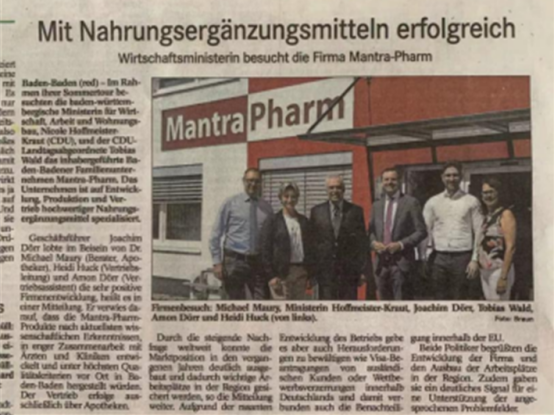 2019年7月30日 巴登符腾堡州经济部长尼科霍夫迈斯特考特博士(Hoffmaeister Kraut)参观曼德制药,当天德国媒体以德国"成功的自然制药公司为标题报道此次参访。至此曼德品牌无可动摇地成为德国自然制剂第一品牌。