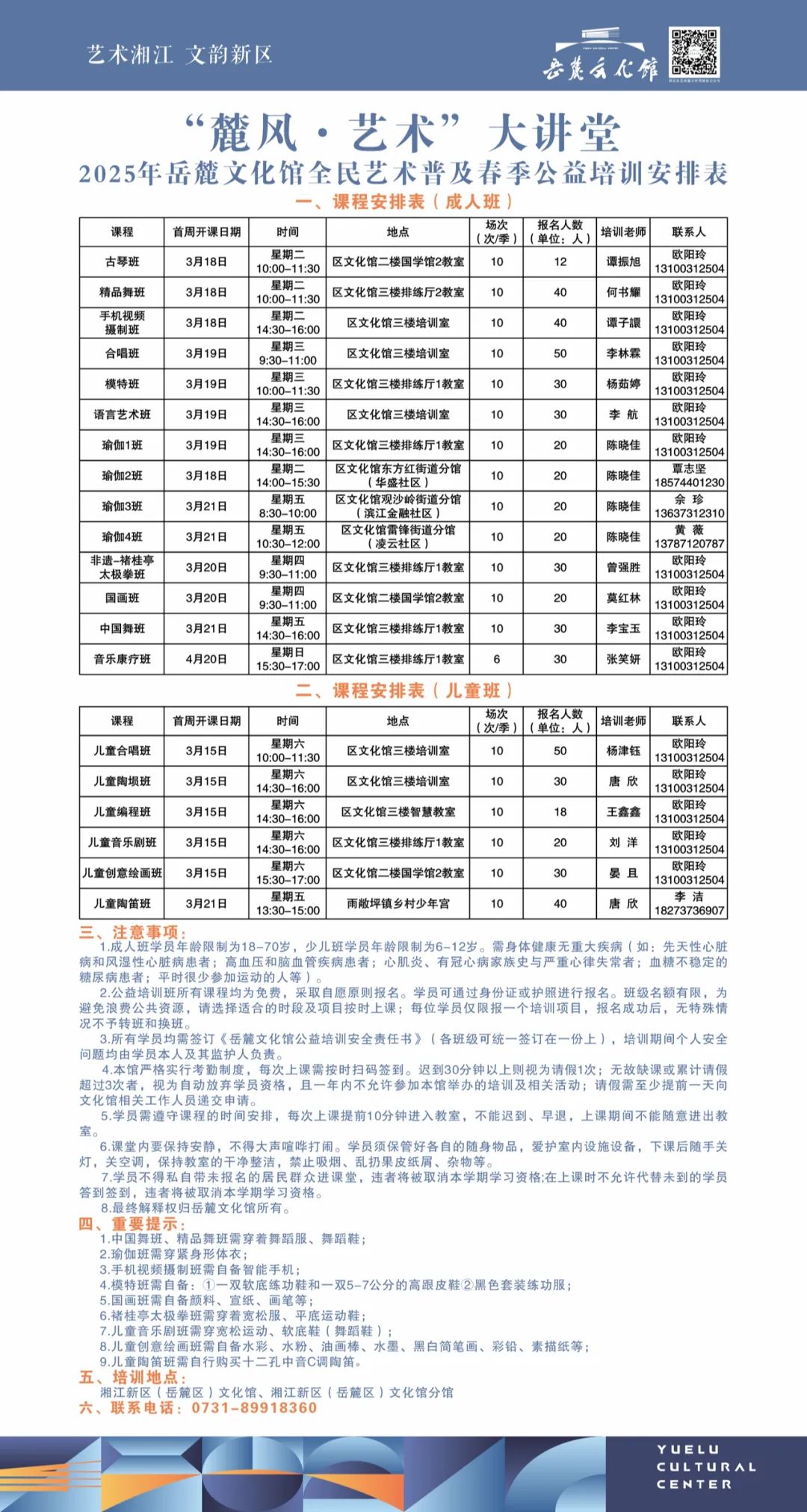 就拿今年上半年启动的“麓风·艺术”2025年岳麓文化馆全民艺术普及春季公益培训来说,成人班+儿童班20门课程,17个类别全免费,从非遗太极拳到中国舞,从国画到儿童音乐剧全部有所涉及。