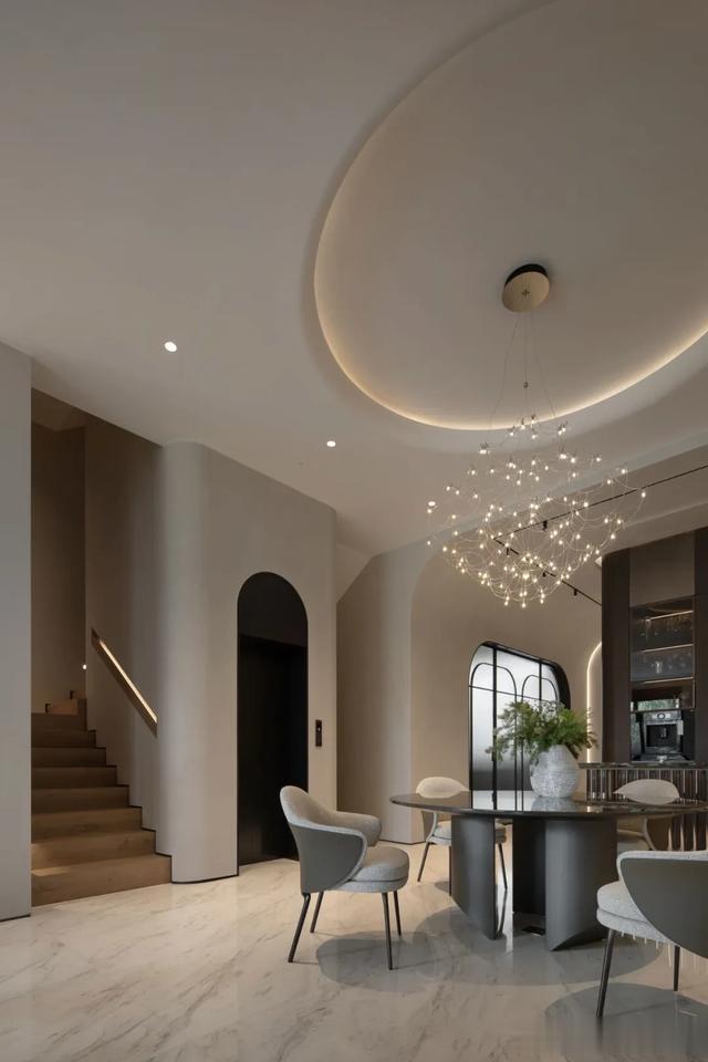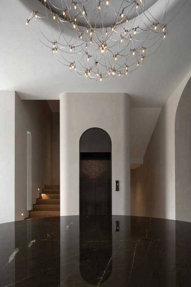 入户空间像是一首音乐的序曲,能由之感受到整体空间设计的基调。地下室门厅入口空间设置了椭圆性的挑空,简约的材质,多种曲面结合的构造,现代感十足的吊灯组合,空间弥漫着优雅而高贵隐秘的气质。
